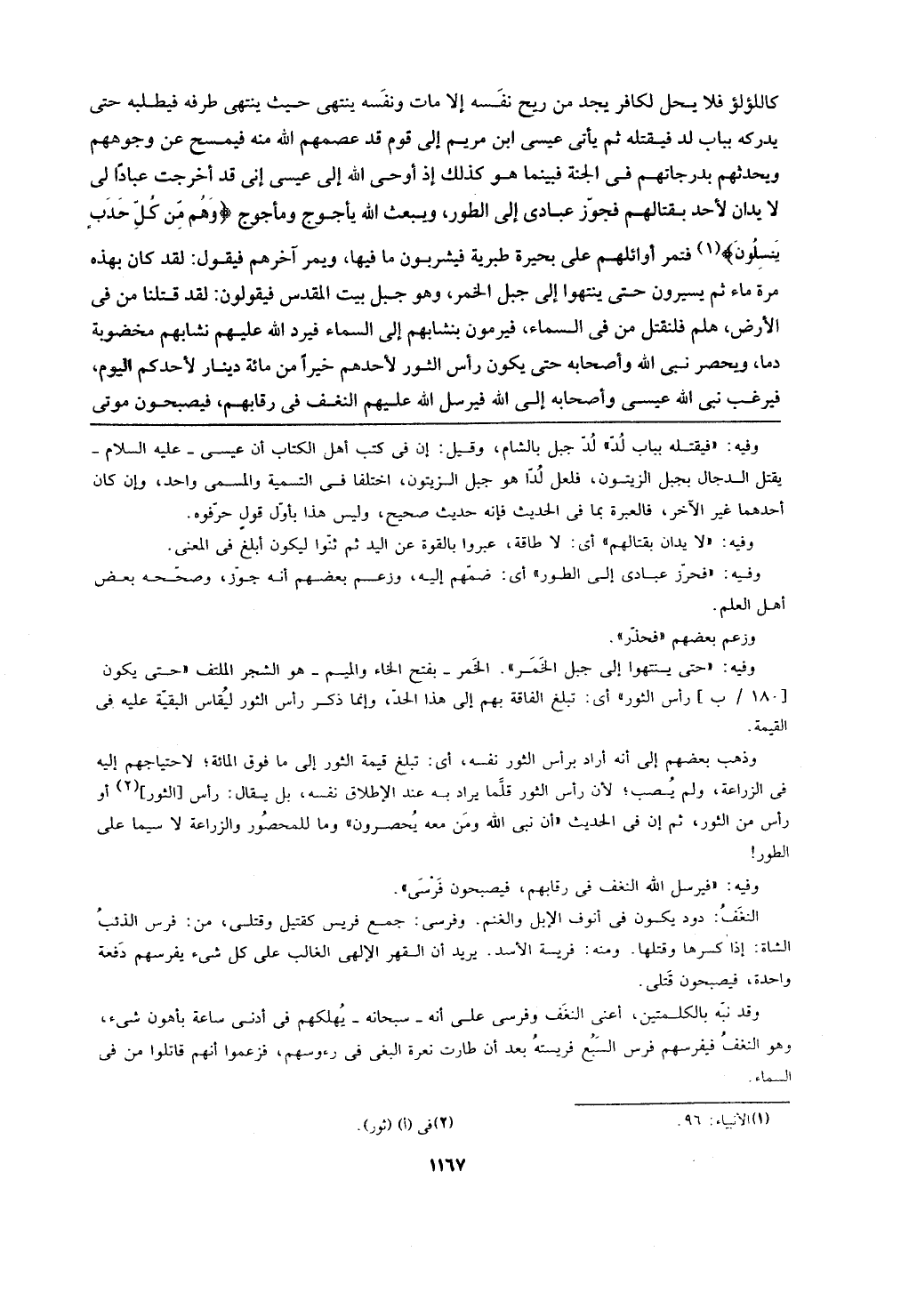 وفيه: (فيقتله بباب لد) لد جبل الشام، وقيل: إن في كتب أهل الكتاب أن عيسى -عليه السلام- يقتل الدجال بجبل الزيتون، فلعل لدا هو جبل الزيتون، اختلفا في التسمية والمسمى واحد، وإن كان أحدهما غير الآخر، فالعبرة بما في الحديث فإنه حديث صحيح، وليس هذا بأول قول حرفوه.
