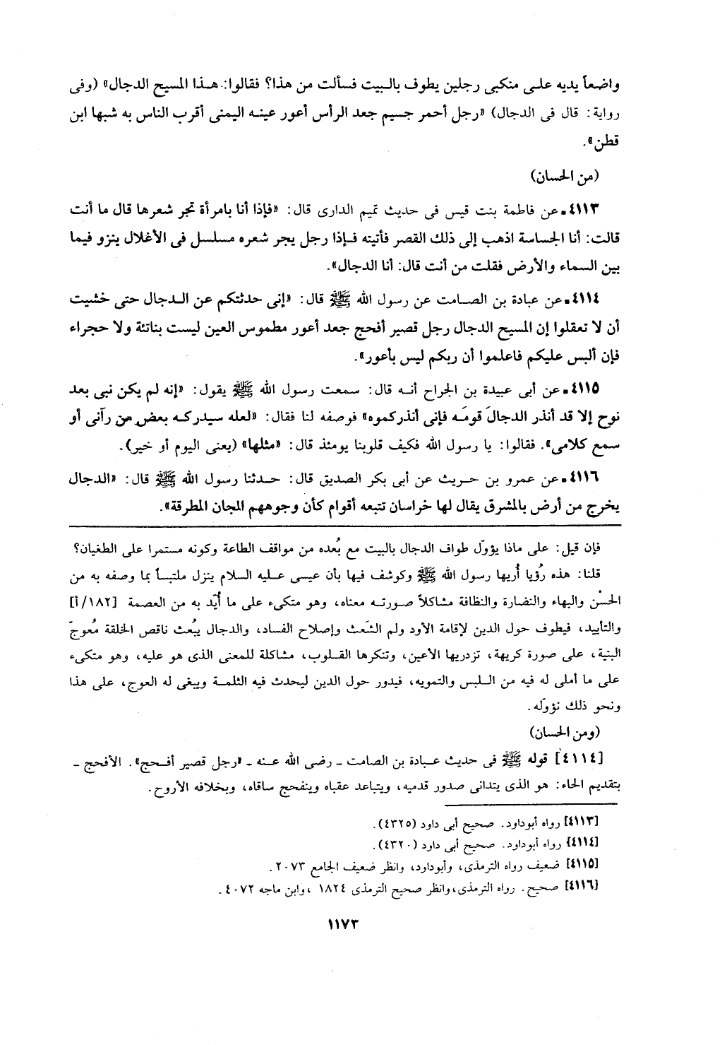 قلنا: هذه رؤيا أريها رسول الله - صلى الله عليه وسلم - وكوشف فيها بأن عيسى -عليه السلام- ينزل ملتبسا بما وصفه به من الحسن والبهاء والنظافة مشاكلا صورته معناه، وهو متكئ على ما أيد به من العصمة] 182/أ [والتأييد، فيطوف حول الدين لإقامة الأود ولم الشعث وإصلاح الفساد، والدجال يبعث ناقص الخلقة، معوج البنية، على صورة كريهة، تزدريها الأعين، وتنكرها القلوب، مشاكلة للمعنى الذي هو عليه وهو متكئ على ما أملي له فيه من اللبس والتمويه، فيدور حول الدين ليحدث فيه الثلمة ويبغي له العوج، على هذا، ونحو ذلك نؤوله.