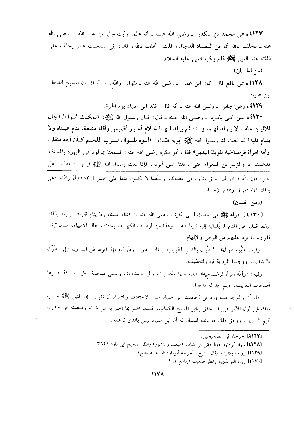 قلت: والوجه فيما ورد في أحاديث ابن صياد من الاختلاف والتضاد أن نقول, أن النبي - صلى الله عليه وسلم - حسب ذلك في اول الأمر قبل التحقق بخبر المسيح الكذاب، فلما أخبر بما أخبر به من شأنه وقصته في حديث تميم الداري، ووافق ذلك ما عنده استبان له أن ابن الصياد ليس بالذي توهمه.