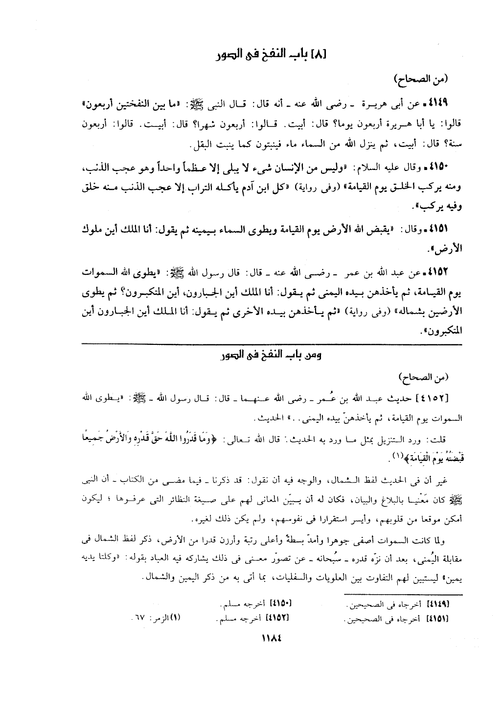 ] 4152 [حديث عبد الله بن عمر -رضي الله عنهما- قال: قال رسول الله - صلى الله عليه وسلم -: (يطوي الله السموات يوم القيامة، ثم يأخذهن بيده اليمنى ...) الحديث.