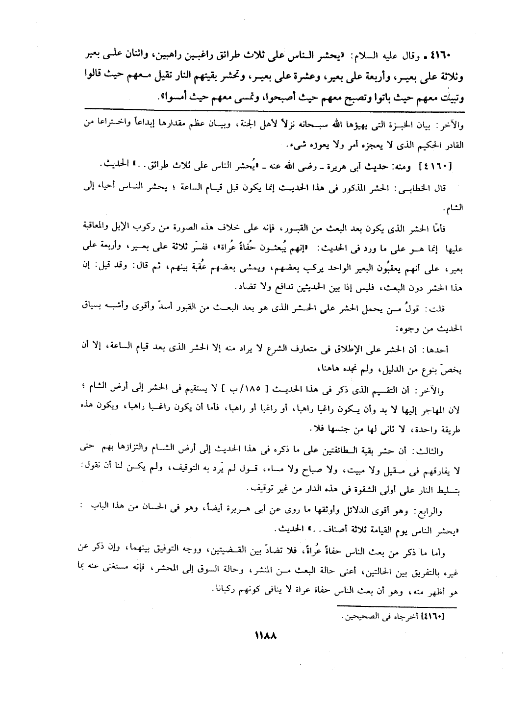 والآخر أن التقسيم الذي ذكر في هذا الحديث] 185/ب [لا يستقيم في الحشر إلى أرض الشام؛ لأن المهاجر إليها لابد أن يكون راغبا راهبا، أو راغبا راهبا، فأما أن يكون راغبا راهبا، ويكون هذه طريقة واحدة، لا ثاني لها من جنسها فلا.