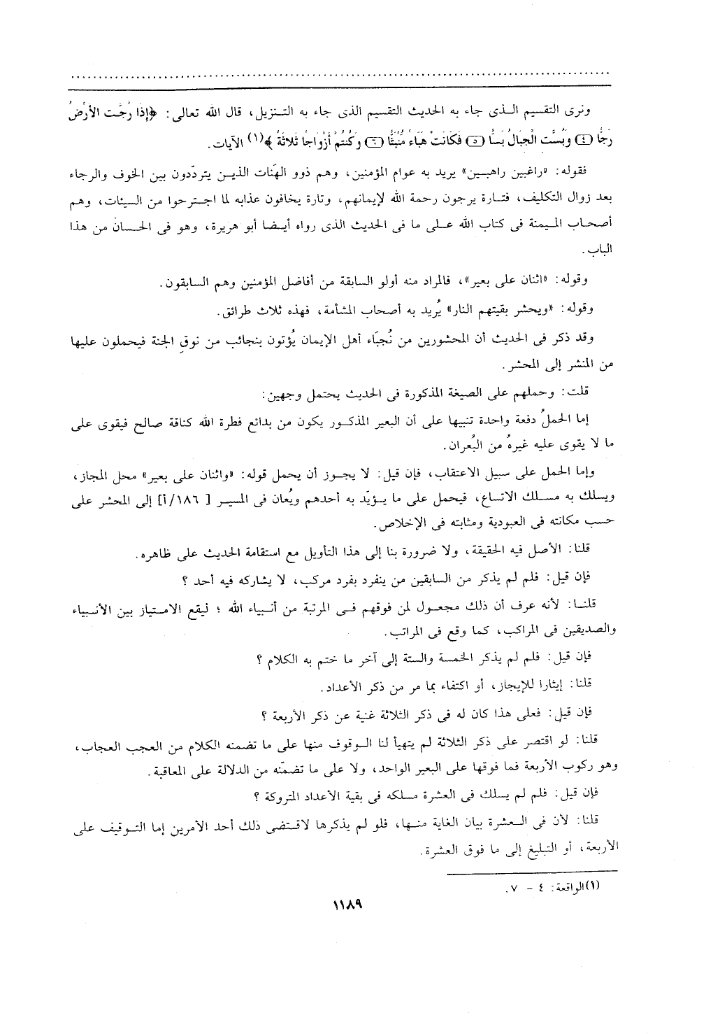 ونرى التقسيم الذي جاء به الحديث التقسيم الذي جاء به التنزيل، قال الله -تعالى-: {إذا رجت الأرض رجا (4) وبست الجبال بسا (5) فكانت هباء منبثا (6) وكنتم أزواجا ثلاثة} الآيات.