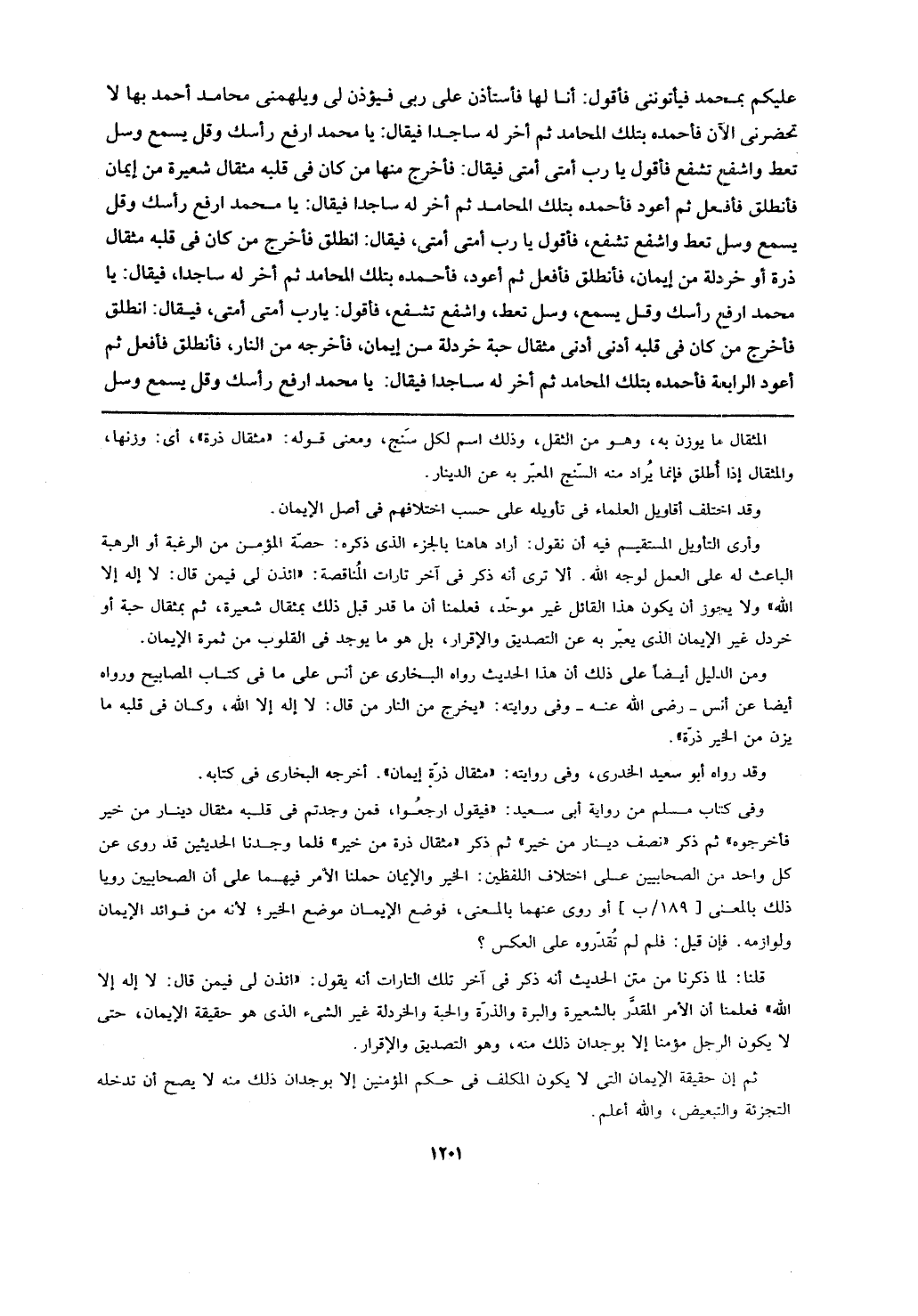 قلنا: لما ذكرنا من متن الحديث أنه ذكر في آخر تلك التارات أنه يقول: (ائذن لي فيمن قال: لا إله إلا الله) فعلمنا أن الأمر المقدر بالشعيرة والبرة والذرة والحبة والخردلة غير الشيء الذي هو حقيقة الإيمان، حتى لا يكون الرجل مؤمناً إلى بوجدان ذلك منه، وهو التصديق والإقرار.