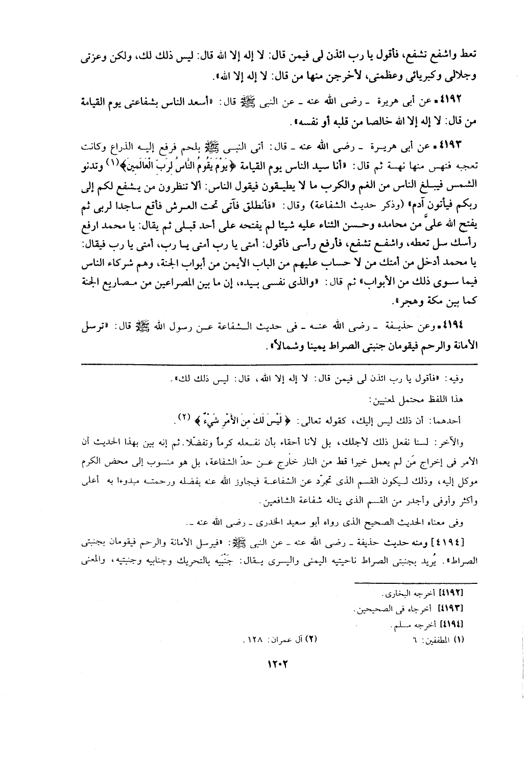 والآخر: لسنا نفعل ذلك لأجلك، بل لأنا أحقاء بأن نفعله كرماً وتفضلاً. ثم إنه بين بهذا الحديث أن الأمر في إخراج من لم يعمل خيراً قط من النار خارج عن حد الشفاعة، بل هو منسوب إلى محض الكرم موكل إليه، وذلك ليكون القسم الذي تجرد عن الشفاعة فيجاوز الله عنه بفضله ورحمته مبدوءاً به أعلى وأكثر وأوفى وأجدر من القسم الذي يناله شفاعة الشافعين.