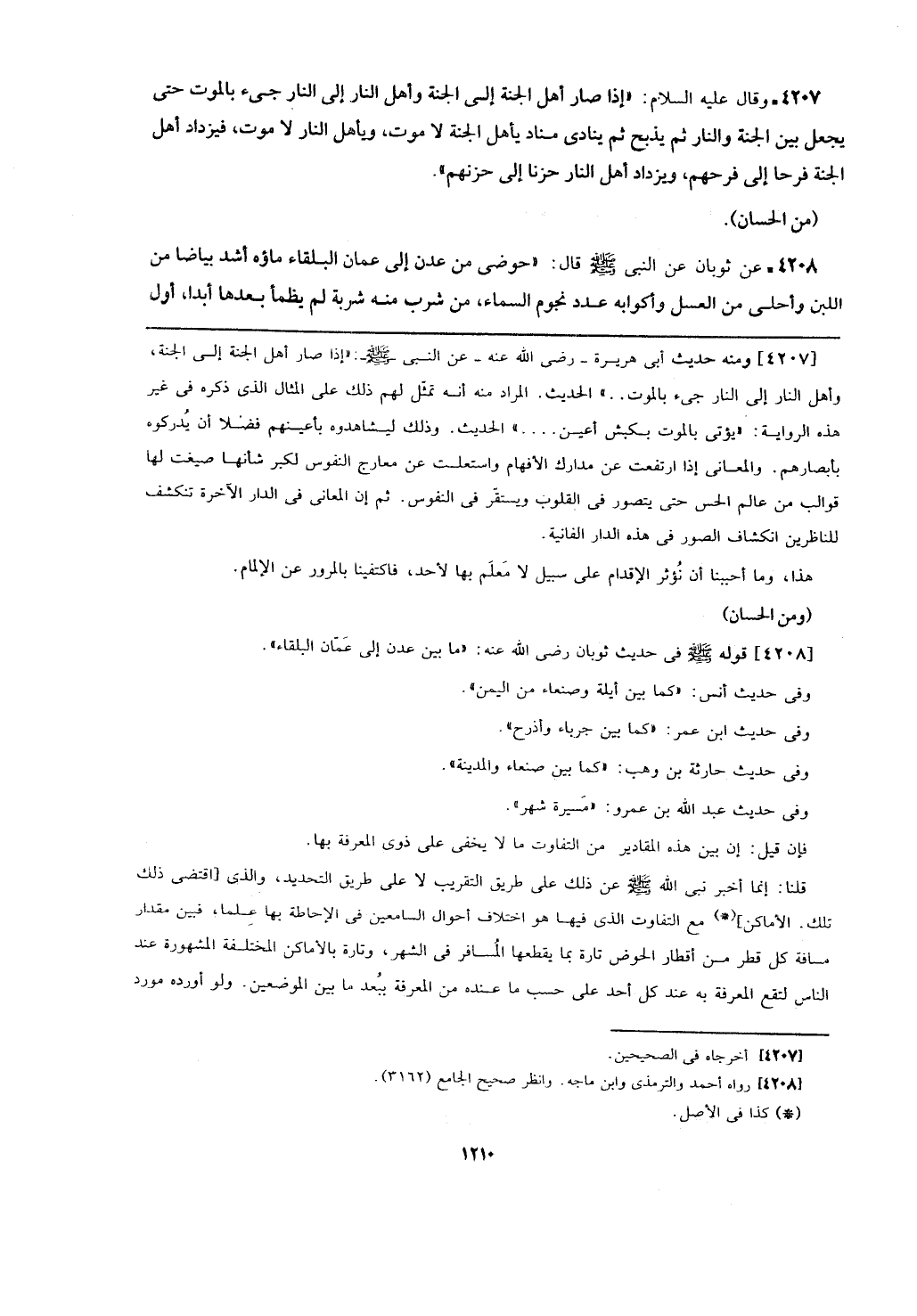 [4207] ومنه حديث أبي هريرة- رضي الله عنه- عن النبي - صلى الله عليه وسلم -: (إذا صار أهل الجنة إلى الجنة، وأهل النار إلى النار جيء بالموت ..) الحديث. المراد منه أنه تمثل لهم ذلك على المثال الذي ذكره في غير هذه الرواية: (يؤتي بالموت بكبش أعين ...) الحديث. وذلك ليشاهدوه بأعينهم فضلاً أن يدركوه بأبصارهم. والمعاني إذا ارتفعت عن مدارك الأفهام واستعلت عن معارج النفوس لكبر شأنها صيغت لها قوالب من عالم الحس حتى يتصور في القلوب ويستقر في النفوس. ثم إن المعاني في الدار الآخرة تتكشف للناظرين انكشاف الصور في هذه الدار الفانية.