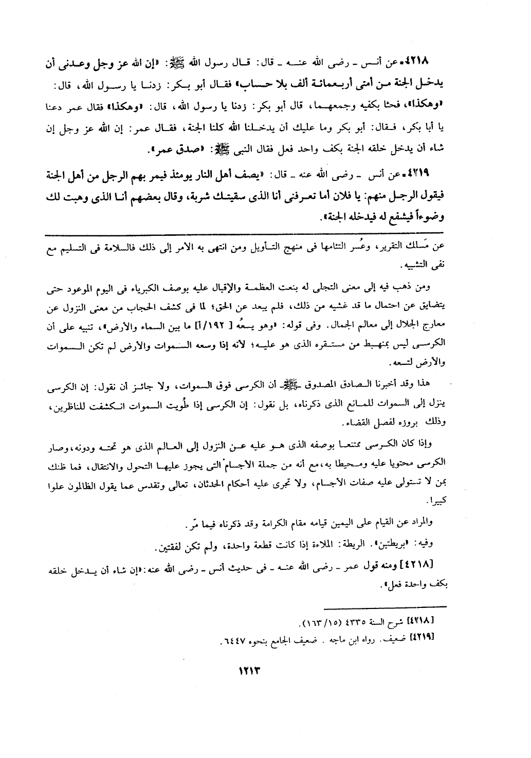 [4218] ومنه قول عمر- رضي الله عنه- في حديث أنس- رضي الله عنه: (إن شاء أن يدخل خلقه بكف واحدة فعل).