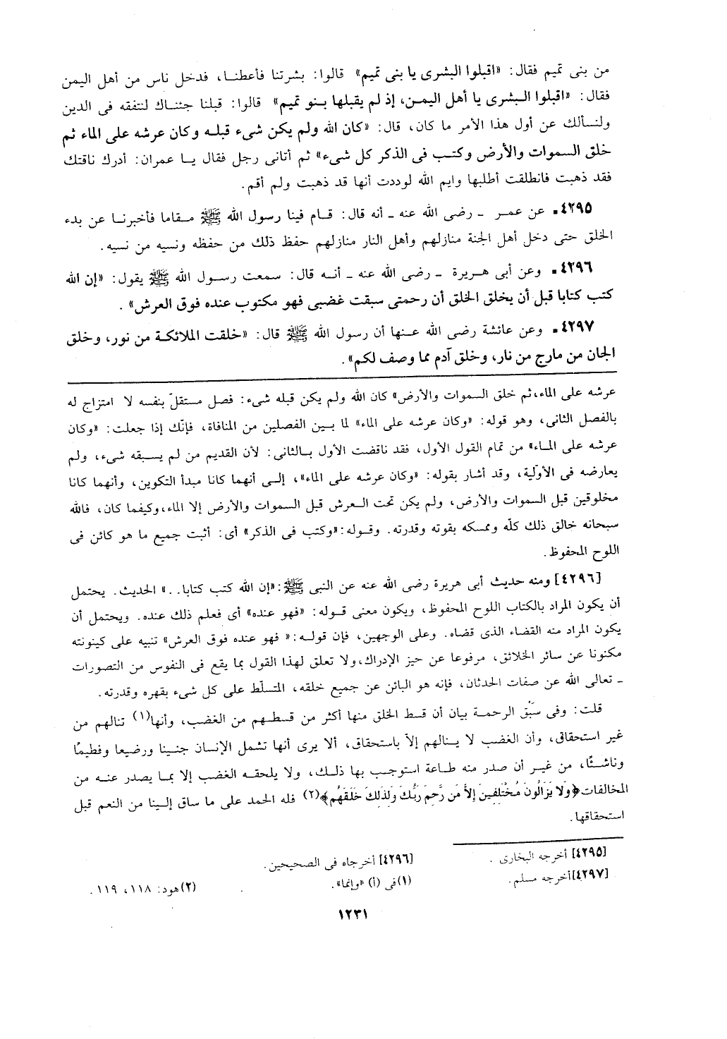 [4296] ومنه حديث أبي هريرة رضي الله عنه عن النبي - صلى الله عليه وسلم -: (إن الله كتب كتاباً ..) الحديث. يحتمل أن يكون المراد بالكتاب اللوح المحفوظ، ويكون معنى قوله: (فهو عنده) أي فعلم ذلك عنده. ويحتمل أن يكون المراد منه القضاء الذي قضاه. وعلى الوجهين، فإن قوله: (فهو عنده فوق العرش) تنبيه على كينونته مكنوناً عن سائر الخلائق، مرفوعاً عن حيز الإدراك، ولا تعلق لهذا القول بما يقع في النفوس من التصورات- تعالى الله عن صفات الحدثان، فإنه هو البائن عن جميع خلقه، المتسلط على كل شيء بقهره وقدرته.