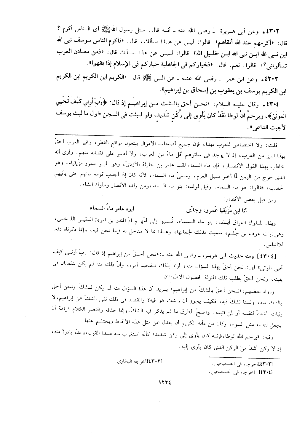 ورواه بعضهم: (نحن أحق بالشك من إبراهيم) يريد أن هذا السؤال منه لم يكن لشك، ونحن أحق بالشك منه، ولسنا نشك فيه، فكيف يجوز أن يشك هو فيه؟ والقصد في نفي الشك عن إبراهيم، لا إثبات الشك لنفسه أو لمن اتبعه. وأصح الطرق ما لم يذكر فيه الشك، وإنما حذفه واقتصر الكلام كراهة أن يجعل لنفسه مثل السوء، وكان من دأبه الكريم أن يعدل عن مثل هذه الألفاظ ويحتشم عنها.
