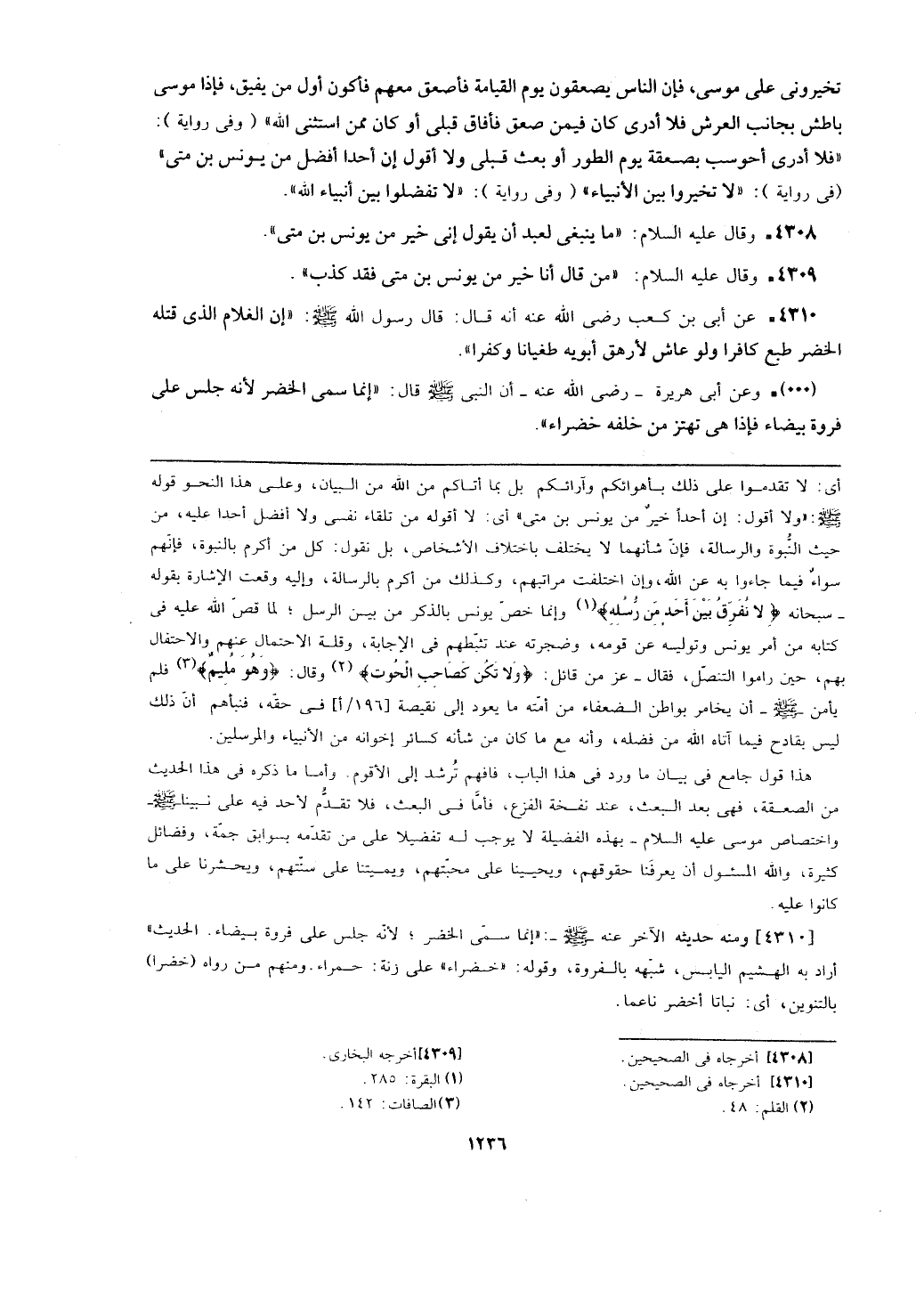 أي: لا تقدموا على ذلك بأهوائكم وآرائكم بل بما أتاكم من الله من البيان، وعلى هذا النحو قوله - صلى الله عليه وسلم -: (ولا أقول: إن أحداً خير من يونس بن متى) أي: لا أقوله من تلقاء نفسي ولا أفضل أحداً عليه، من حيث النبوة والرسالة، فإن شأنهما لا يختلف باختلاف الأشخاص، بل نقول: كل من أكرم بالنبوة، فإنهم سواء فيما جاءوا به عن الله، وإن اختلفت مراتبهم، وكذلك من أكرم بالرسالة، وإليه وقعت الإشارة بقوله سبحانه {لا نفرق بين أحد من رسله} وإنما خص يونس بالذكر من بين الرسل؛ لما قص الله عليه في كتابه من أمر يونس وتوليه عن قومه، وضجرته عند تثبطهم في الإجابة، وقلة الاحتمال عنهم والاحتفال بهم، حين راموا التنصل، فقال -عز من قائل: {ولا تكن كصاحب الحوت} وقال: {وهو مليم} فلم يأمن - صلى الله عليه وسلم - أن يخامر بواطن الضعفاء من أمته ما يعود إلى نقيصة [196/أ] في حقه، فنبأهم أن ذلك ليس بقادح فيما آتاه الله من فضله، وأنه مع ما كان من شأنه كسائر إخوانه من الأنبياء والمرسلين.