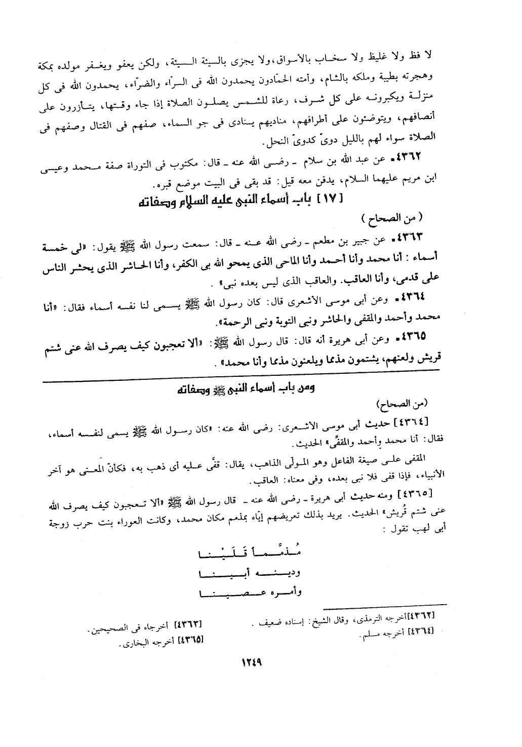 [4365] ومنه حديث أبي هريرة- رضي الله عنه- قال رسول الله - صلى الله عليه وسلم -: (ألا تعجبون كيف يصرف الله عني شتم قريش) الحديث. يريد بذلك تعريضهم إياه بمذمم مكان محمد، وكانت العوراء بنت حرب زوجة أبي لهب تقول: