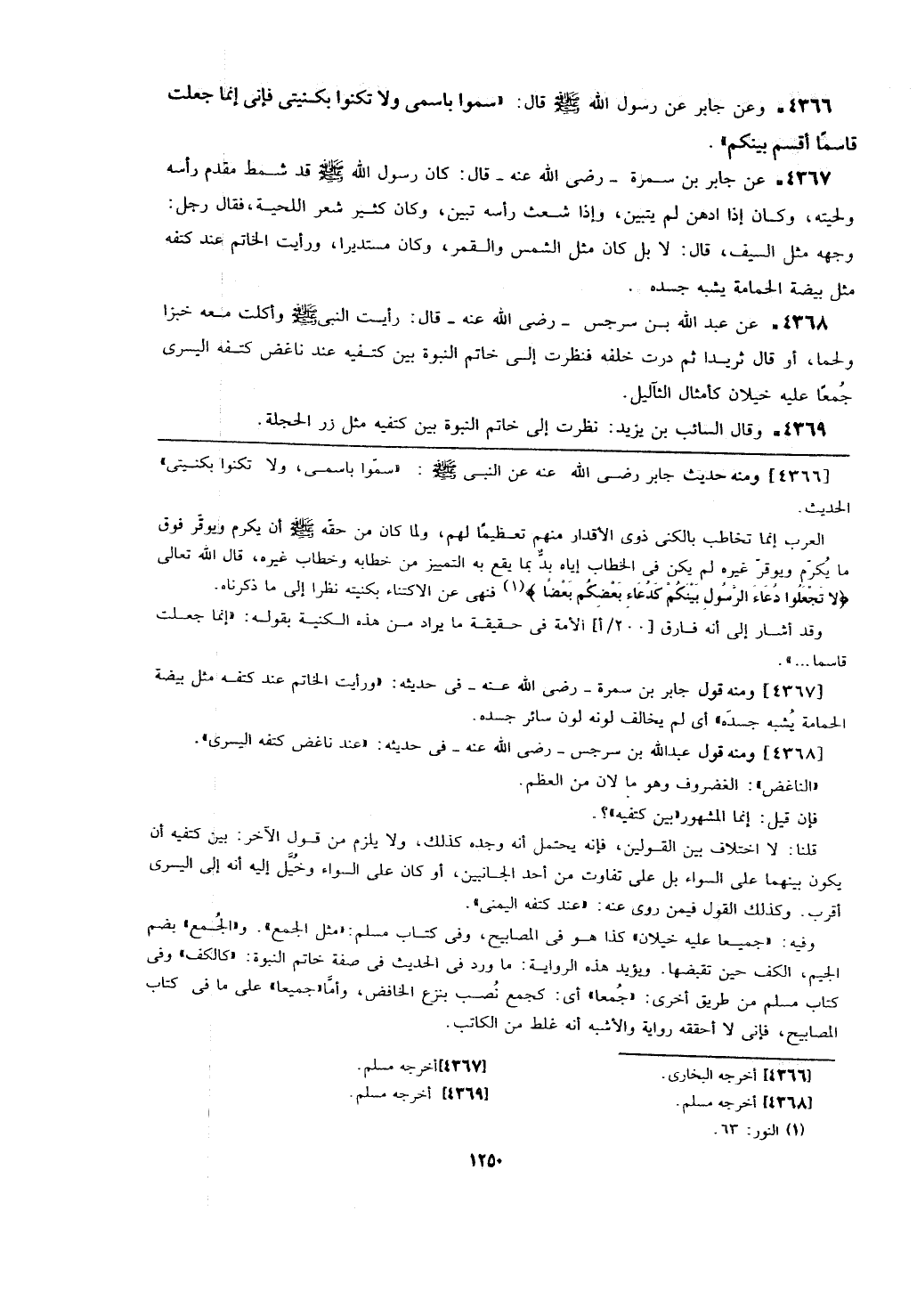 [4367] ومنه قول جابر بن سمرة- رضي الله عنه- في حديثه: (ورأيت الخاتم عند كتفه مثل بيضة الحمامة يشبه جسده) أي لم يخالف لونه لون سائر جسده.