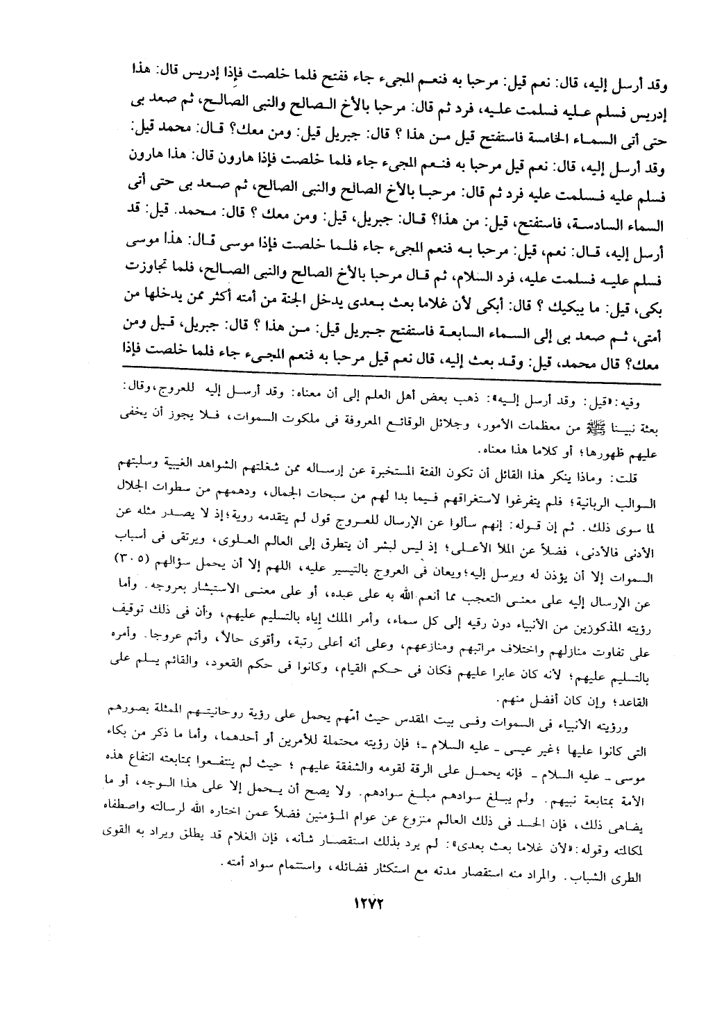 قلت: وماذا ينكر هذا القائل أن تكون الفئة المستخبرة عن إرساله ممن شغلتهم الشواهد الغيبية وسلبتهم السوالب الربانية؛ فلم يتفرغوا لاستغرقاهم فيما بدا لهم من سبحات الجمال، ودهمهم من سطوات الجلال لما سوى ذلك. ثم إن قوله: إنهم سألوا عن الإرسال للعروج قول لم يتقدمه روية؛ إذ لا يصدر مثله عن الأدنى فالأدنى، فضلا عن الملأ الأعلى؛ إذ ليس لبشر أن يتطرق إلى العالم العلوي، ويرتقي في أسباب السموات إلا أن يؤذن له ويرسل إليه؛ ويعان في العروج بالتيسير عليه، اللهم إلا أن يحمل سؤالهم (305) عن الإرسال إليه على معنى التعجب مما أنعم الله به على عبده، أو على معنى الاستبشار بعروجه. وأما رؤيته المذكورين من الأنبياء دون رقيه إلى كل سماء، وأمر الملك إياه بالتسليم عليهم، وأن في ذلك توقيف على تفاوت منازلهم واختلاف مراتبهم ومنازعهم، وعلى أنه أعلى رتبة، وأقوى حالا، وأتم عروجا. وأمره بالتسليم عليهم؛ لأنه كان عابرا عليهم فكان في حكم القيام، وكانوا في حكم القعود، والقائم يسلم على القاعد؛ وإن كان أفضل منهم.