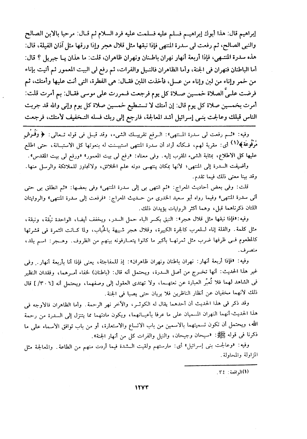 وفي: (فإذا نبقها مثل قلال هجر): النبق بكسر الباء حمل السدر، ويخفف أيضا، الواحدة نبقة، ونبقة، مثل كلمة. والقلة إناء للعرب كالجرة الكبيرة، وقلال هجر شبيهة بالحباب، ولما كانت الثمرة في قشرتها كالمطعوم في ظرفها ضرب مثل ثمرتها بأكبر ما كانوا يتعارفونه بينهم من الظروف. وهجر: اسم بلد، منصرف.