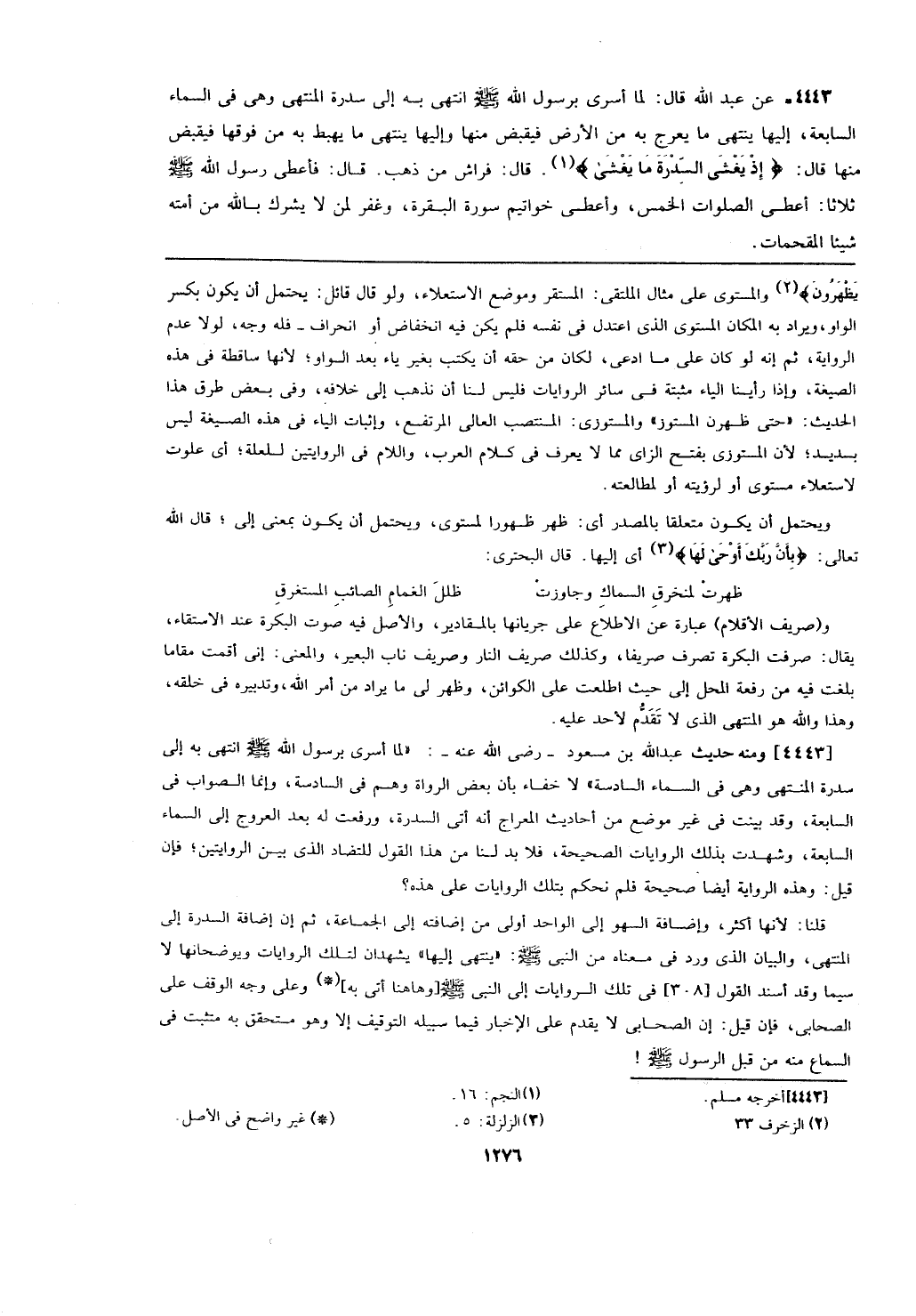 [4443] ومنه حديث عبد الله بن مسعود- رضي الله عنه-: (لما أسري برسول الله - صلى الله عليه وسلم - انتهى به إلى سدرة المنتهى وهي في السماء السادسة) لا خفاء بأن بعض الرواة وهم في السادسة، وإنما الصواب في السابعة، وقد بينت في غير موضع من أحاديث المعراج أنه أتى السدرة، ورفعت له بعد العروج إلى السماء السابعة، وشهدت بذلك الروايات الصحيحة، فلابد لنا من هذا القول للتضاد الذي بين الروايتين؛ فإن قيل: وهذه الرواية أيضا صحيحة فلم نحكم بتلك الروايات على هذه؟
