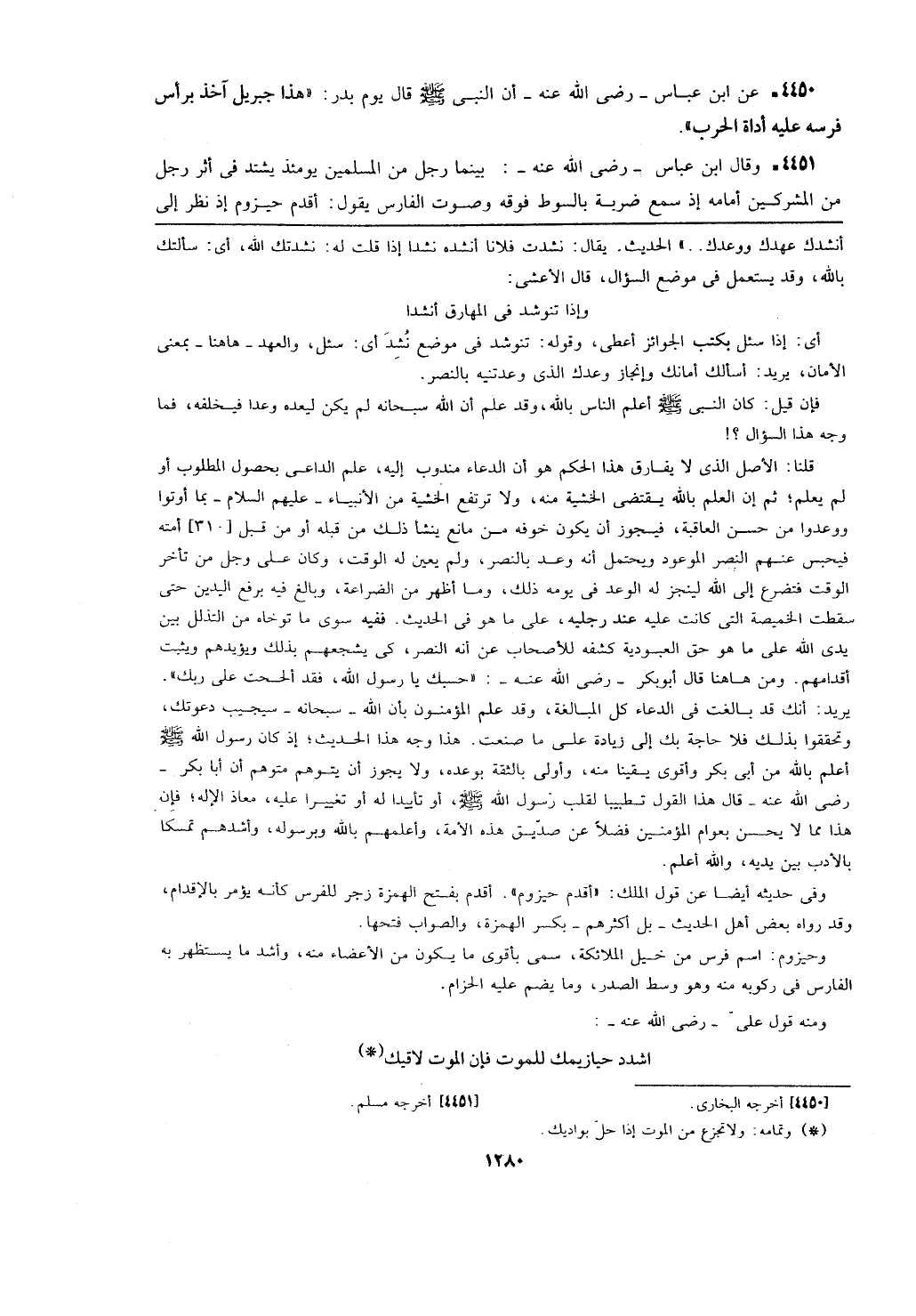 قلنا: الأصل الذي لا يفارق هذا الحكم هو أن الدعاء مندوب إليه، علم الداعي بحصول المطلوب أو لم يعلم؛ ثم إن العلم بالله يقتضي الخشية منه، ولا ترتفع الخشية من الأنبياء- عليهم السلام- بما أوتوا ووعدوا من حسن العاقبة، فيجوز أن يكون خوفه من مانع ينشأ ذلك من قبله أو من قبل [310] أمته فيحبس عنهم النصر الموعود ويحتمل أنه وعد بالنصر، ولم يعين له الوقت، وكان على وجل من تأخر الوقت فتضرع إلى الله لينجز له الوعد في يومه ذلك، وما أظهر من الضراعة، وبالغ فيه برفع اليدين حتى سقطت الخميصة التي كانت عليه عند رجليه، على ما هو في الحديث. ففيه سوى ما توخاه من التذلل بين يدي الله على ما هو حق العبودية كشفه للأصحاب عن أنه النصر، كي يشجعهم بذلك ويؤيدهم ويثبت أقدامهم. ومن هاهنا قال أبو بكر- رضي الله عنه-: (حسبك يا رسول الله، فقد ألححت على ربك). يريد: أنك قد بالغت في الدعاء كل المبالغة، وقد علم المؤمنون بأن الله- سبحانه- سيبجيب دعوتك، وتحققوا بذلك فلا حاجة بك إلى زيادة على ما صنعت. هذا وجه هذا الحديث؛ إذ كان رسول الله - صلى الله عليه وسلم - أعلم بالله من أبي بكر وأقوى يقينا منه، وأولى بالثقة بوعده، ولا يجوز أن يتوهم متوهم أن أبا بكر- رضي الله عنه- قال هذا القول تطبيبا لقلب رسول الله - صلى الله عليه وسلم -، أو تأييدا له أو تغييرا عليه، معاذ الإله؛ فإن هذا مما لا يحسن بعوام المؤمنين فضلا عن صديق هذه الأمة، وأعلمهم بالله وبرسوله، وأشدهم تمسكا بالأدب بين يديه، والله أعلم.