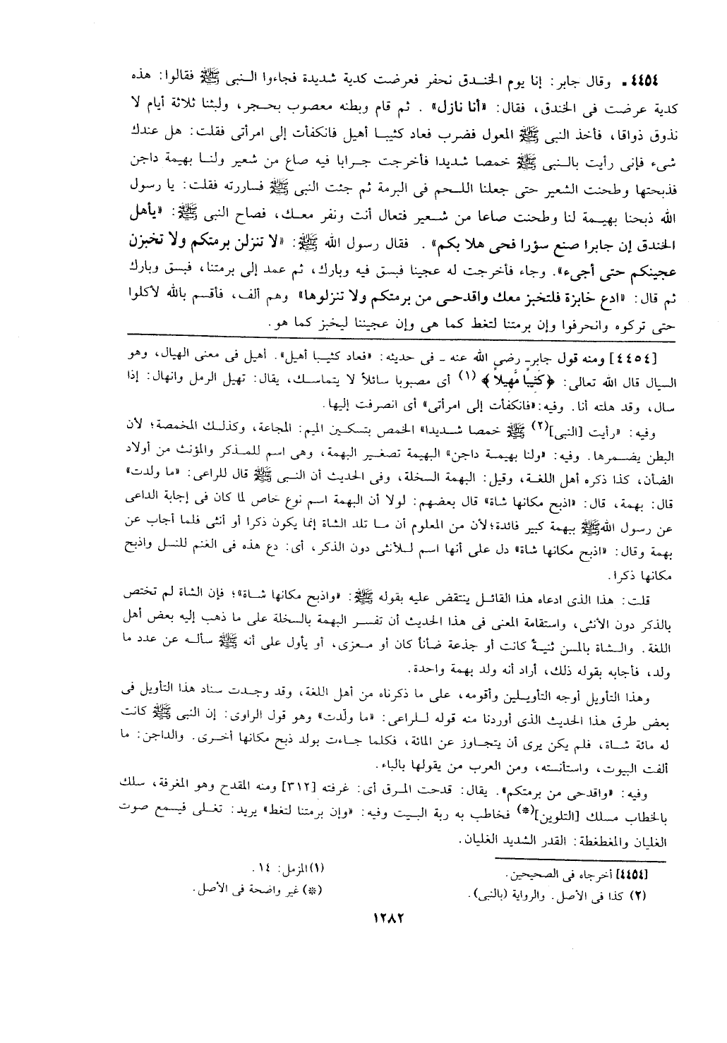 وفيه: (رأيت [النبي]- صلى الله عليه وسلم - خمصا شديدا) الخمص بتسكين الميم: المجاعة، وكذلك المخمصة؛ لأن البطن يضمرها. وفيه: (ولنا بهيمة داجن) البهيمة تصغير البهمة، وهي اسم للمذكر والمؤنث من أولاد الضأن، كذا ذكره أهل اللغة، وقيل: البهمة السخلة، وفي الحديث أن النبي - صلى الله عليه وسلم - قال للراعي: (ما ولدت) قال: بهمة، قال: (اذبح مكانها شاة) قال بعضهم: لولا أن البهمة اسم نوع خاص لما كان في إجابة الداعي عن رسول الله - صلى الله عليه وسلم - ببهمة كبير فائدة؛ لأن من المعلوم أن ما تلد الشاة إنما يكون ذكرا أو أنثى فلما أجاب عن بهمة وقال: (اذبح مكانها شاة) دل على أنها اسم للأنثى دون الذكر، أي: دع هذه في الغنم للنسل واذبح مكانها ذكرا.