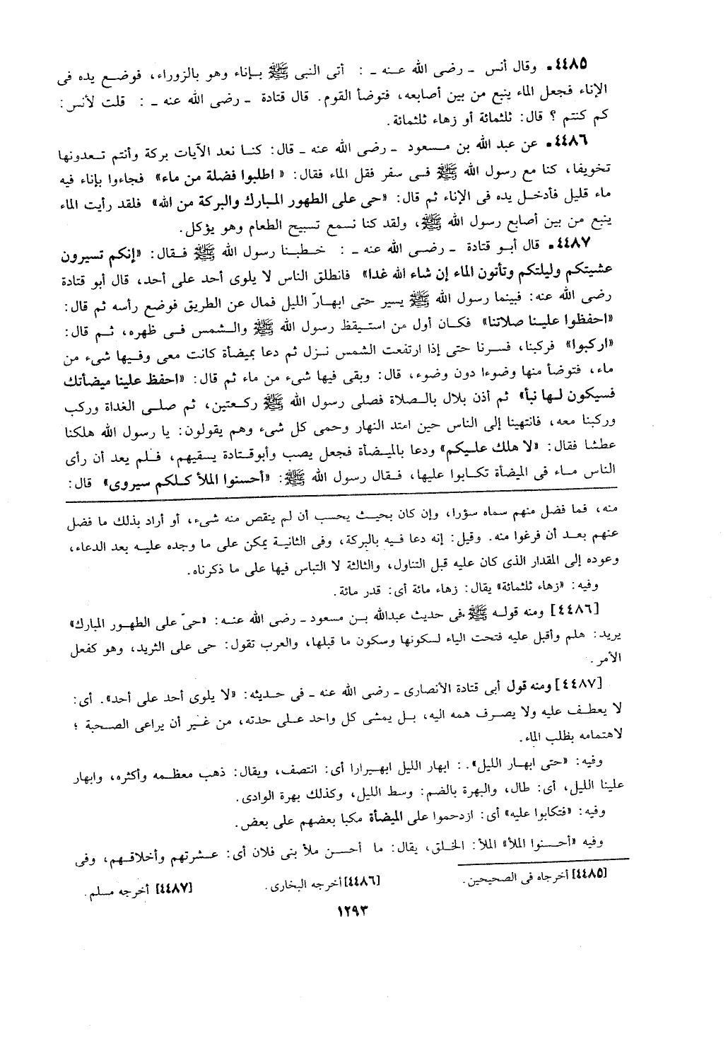 منه، فما فضل منهم سماه سؤرا، وإن كان بحيث يحسب أن لم ينقص منه شيء، أو أراد بذلك ما فضل عنهم بعد أن فرغوا منه. وقيل: إنه دعا فيه بالبركة، وفي الثانية يمكن على ما وجده عليه بعد الدعاء، وعوده إلى المقدار الذي كان عليه قبل التناول، والثالثة لا التباس فيها على ما ذكرناه.