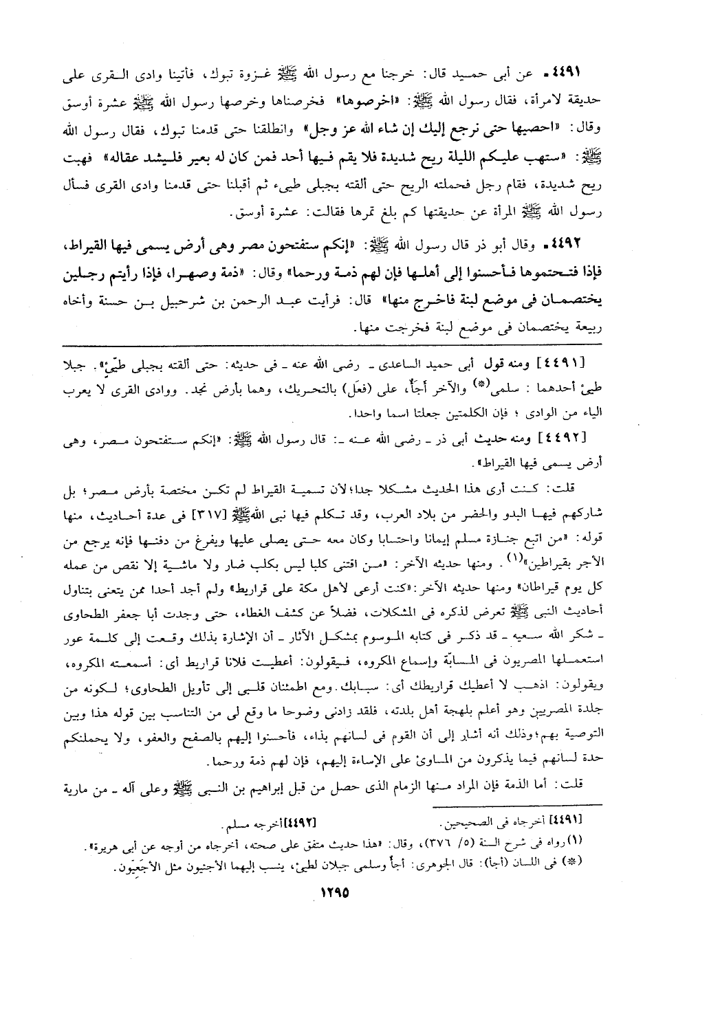 قلت: كنت أرى هذا الحديث مشكلا جدا؛ لأن تسمية القيراط لم تكن مختصة بأرض مصر؛ بل شاركهم فيها البدو والحضر من بلاد العرب، وقد تكلم فيها نبي الله - صلى الله عليه وسلم -[317] في عدة أحاديث، منها قوله: (من اتبع جنازة مسلم إيمانا واحتسابا وكان معه حتى يصلي عليها ويفرغ من دفنها فإنه يرجع من الأجر بقيراطين). ومنها حديثه الآخر: (من اقتنى كلبا ليس بكلب ضار ولا ماشية إلا نقص من عمله كل يوم قيراطان) ومنها حديثه الآخر: (كنت أرعى لأهل مكة على قراريط) ولم أجد أحدا ممن يتعنى بتناول أحاديث النبي - صلى الله عليه وسلم - تعرض لذكره في المشكلات، فضلا عن كشف الغطاء، حتى وحدت أبا جعفر الطحاوي- شكر الله سعيه- قد ذكر في كتابه الموسوم بمشكل الآثار- أن الإشارة بذلك وقعت إلى كلمة عور استعملها المصريون في المسابة وإسماع المكروه، فيقولون: أعطيت فلانا قراريط أي: أسمعته المكروه، ويقولون: اذهب لا أعطيك قراريطك أي: سبابك. ومع اطمئنان قلبي إلى تأويل الطحاوي؛ لكونه من جلدة المصريين وهو أعلم بلهجة أهل بلدته، فلقد زادني وضوحا ما وقع لي من التناسب بين قوله هذا وبين التوصية بهم؛ وذلك أنه أشار إلى أن القوم في لسانهم بذاء، فأحسنوا إليهم بالصفح والعفو، ولا يحملنكم حدة لسانهم فيما يذكرون من المساوئ على الإساءة إليهم، فإن لهم ذمة ورحما.