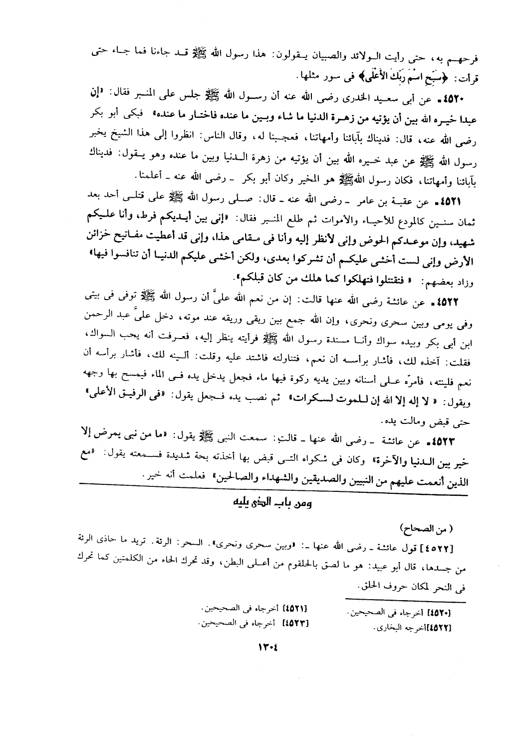[4522] قول عائشة- رضي الله عنها-: (وبين سحرى ونحرى). السحر الرتة. تريد ما حاذى الرئة من جسدها، قال أبو عبيد: هو ما لصق الحلقوم من أعلى البطن، وقد تحرك الحاء من الكلمتين كما تحرك في النحر لمكان حروف الحلق.
