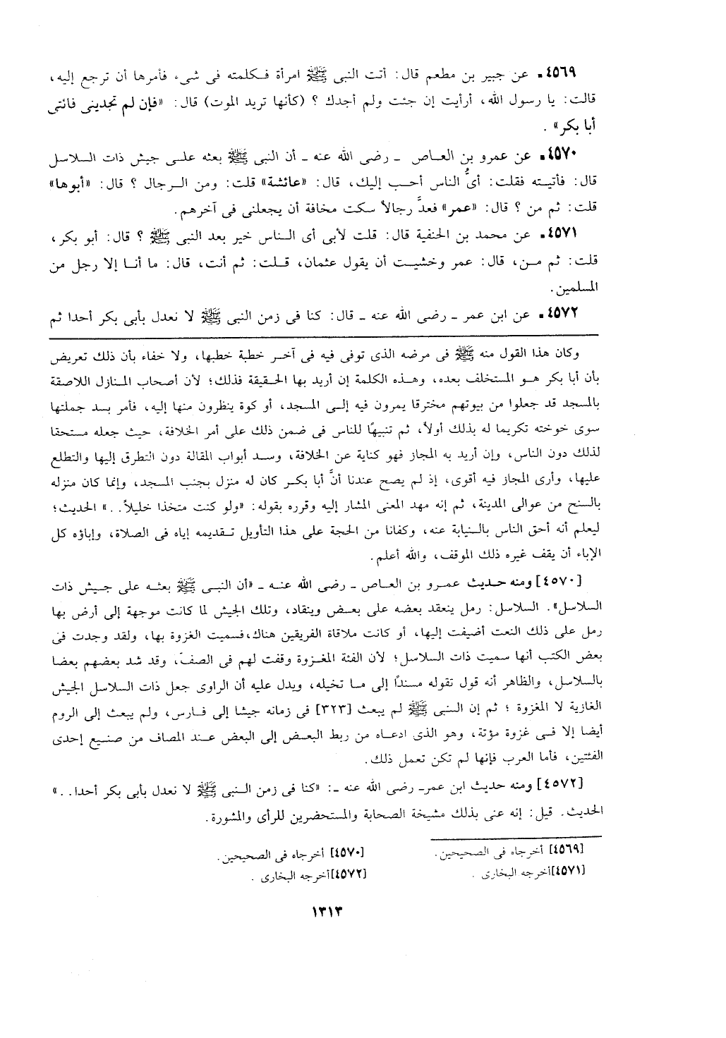[4570] ومنه حديث عمرو بن العاص- رضي الله عنه- (أن النبي - صلى الله عليه وسلم - بعثه على جيش ذات السلاسل). السلاسل: رمل ينعقد بعضه على بعض وينقاد، وتلك الجيش لما كانت موجهة إلى أرض بها رمل على ذلك النعت أضيفت إليها، أو كانت ملاقاة الفريقين هناك، فسميت الغزوة بها، ولقد وجدت في بعض الكتب أنها سميت ذات السلاسل؛ لأن الفئة المغزوة وقفت لهم في الصف، وقد شد بعضهم بعضا بالسلاسل، والظاهر أنه قول تقوله مسندا إلى ما تخيله، ويدل عليه أن الراوي جعل ذات السلاسل الجيش الغازية لا المغزوة؛ ثم إن النبي - صلى الله عليه وسلم - لم يبعث [323] في زمانه جيشا إلى فارس، ولم يبعث إلى الروم أيضا إلا في غزوة مؤته، وهو الذي ادعاه من ربط البعض إلى البعض عند المصاف من صنيع إحدى الفئتين، فأما العرب فإنها لم تكن تعمل ذلك.