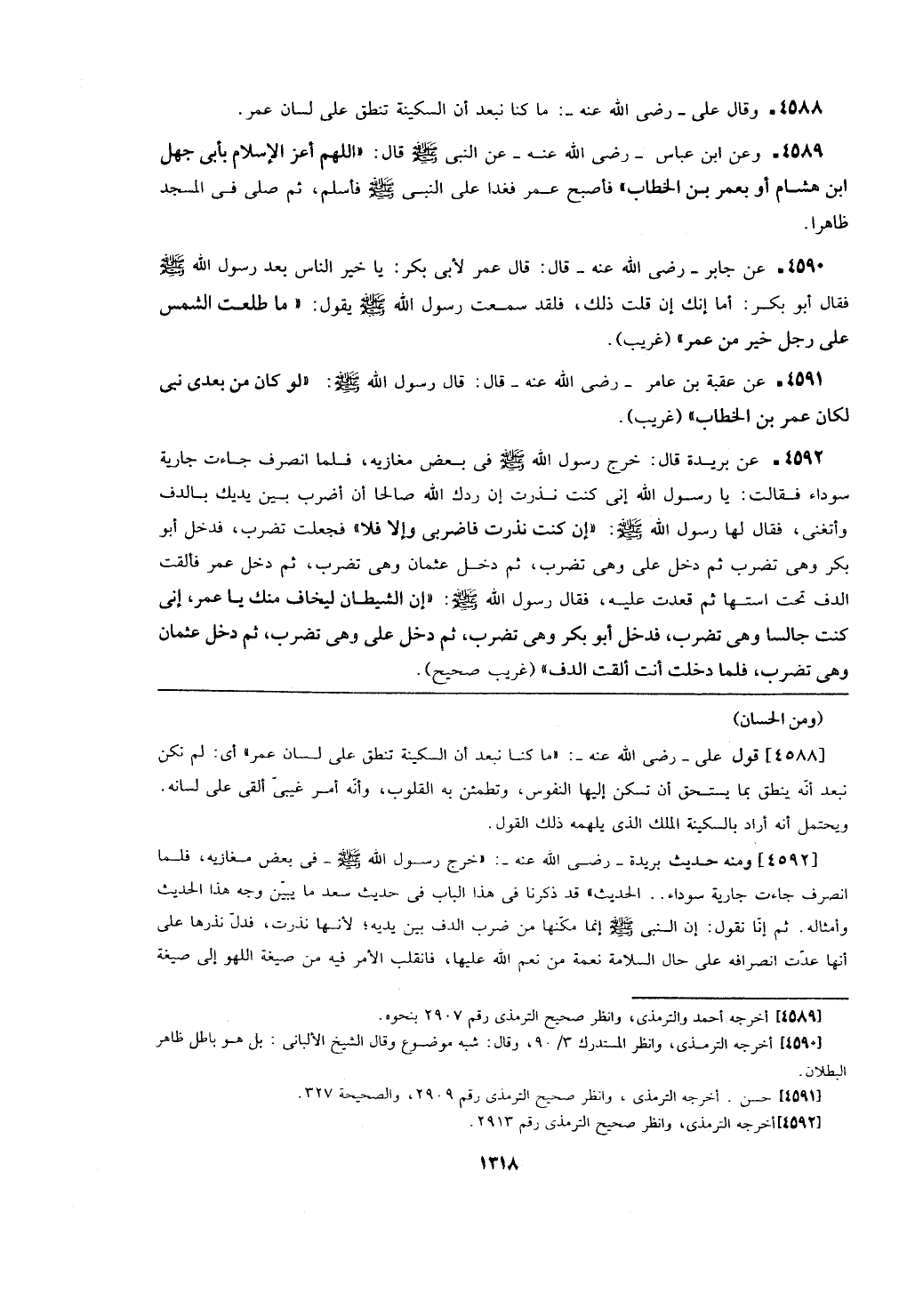 [4588] قول علي- رضي الله عنه-: (ما كنا نبعد أن السكينة تنطق على لسان عمر) أي: لم نكن نبعد أنه ينطق بها بما يستحق أن تسكت إليه النفوس، وتطمئن به القلوب، وأنه أمر غيبي ألقى على لسانه. ويحتمل أنه أراد بالسكينة الملك الذي يلهمه ذلك القول.