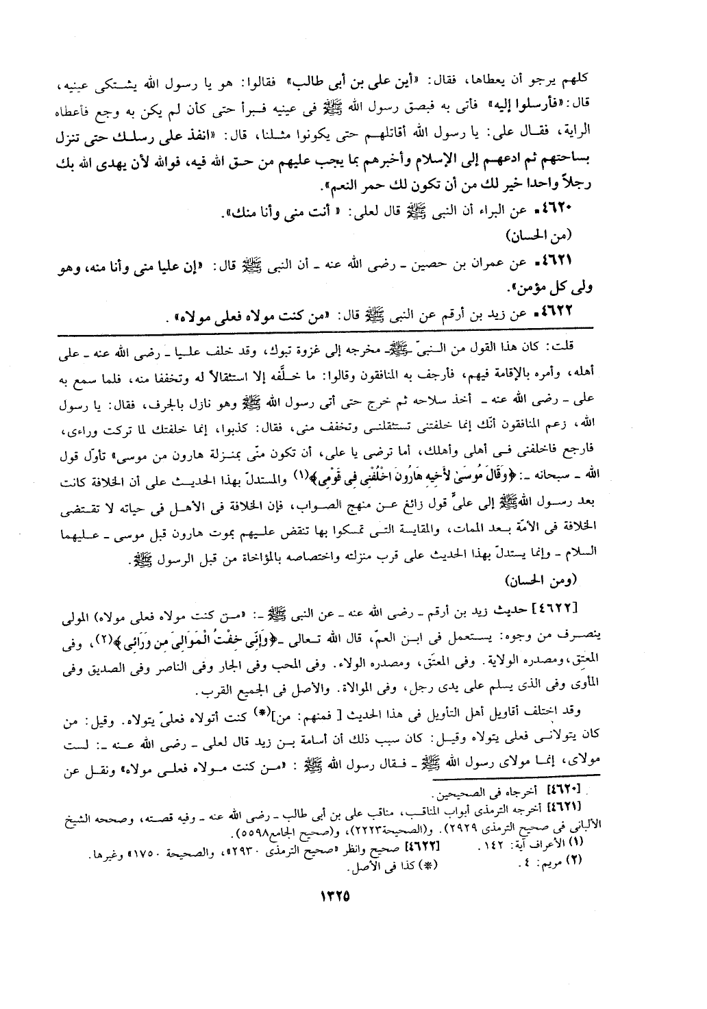 [4622] حديث زيد بن أرقم- رضي الله عنه- عن النبي - صلى الله عليه وسلم -: (من كنت مولاه فعلى مولاه) المولى ينصرف من وجوه: يستعمل في ابن العم، قال الله تعالى- {وإني خفت الموالي من ورائي}، وفي المعتق، ومصدره الولاية. وفي المعتق، ومصدره الولاء. وفي المحب وفي الجار وفي الناصر وفي الصديق وفي المأوى وفي الذي يسلم على يدي رجل، وفي المولاة. والأصل في الجميع القرب.