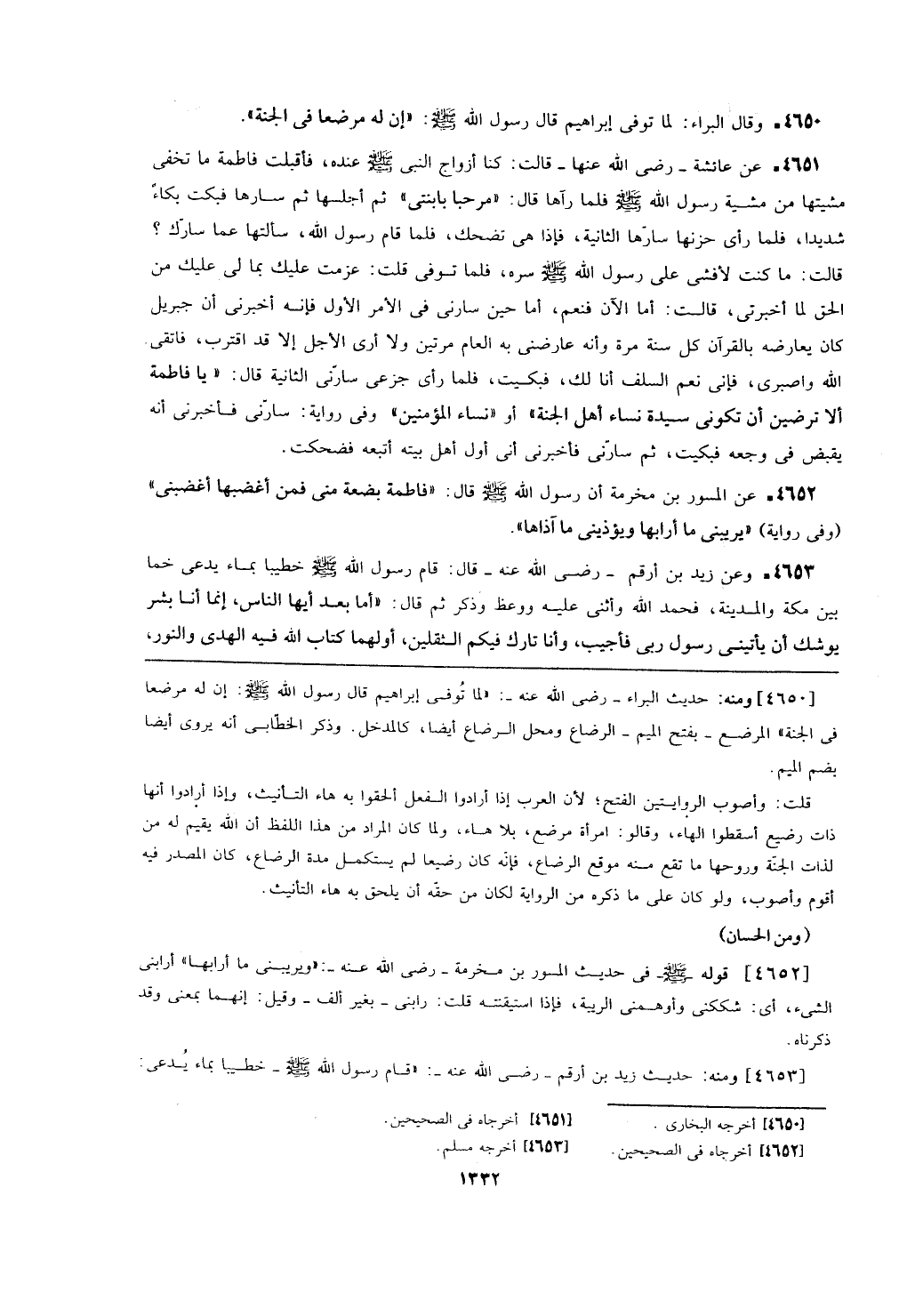 [4650] ومنه: حديث البراء- رضي الله عنه-: (لما توفي إبراهيم قال رسول الله - صلى الله عليه وسلم -: إن له مرضعا في الجنة) المرضع- بفتح الميم- الرضاع ومحل الرضاع أيضا، كالمدخل. وذكر الخطابي أنه يروي أيضا بضم الميم.