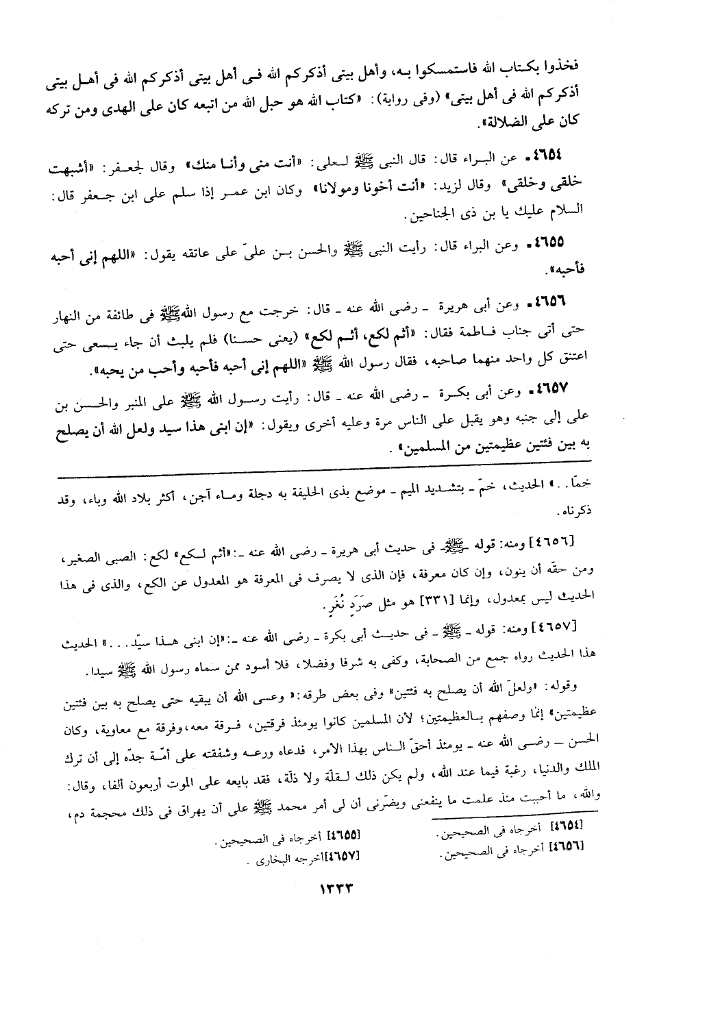 [4657] ومنه: قوله - صلى الله عليه وسلم - في حديث أبي بكرة- رضي الله عنه-: (إن ابنى هذا سيد ..) الحديث هذا الحديث رواه جمع من الصحابة، وكفى به شرفا وفضلا، فلا أسود ممن سماه رسول الله - صلى الله عليه وسلم - سيدا.