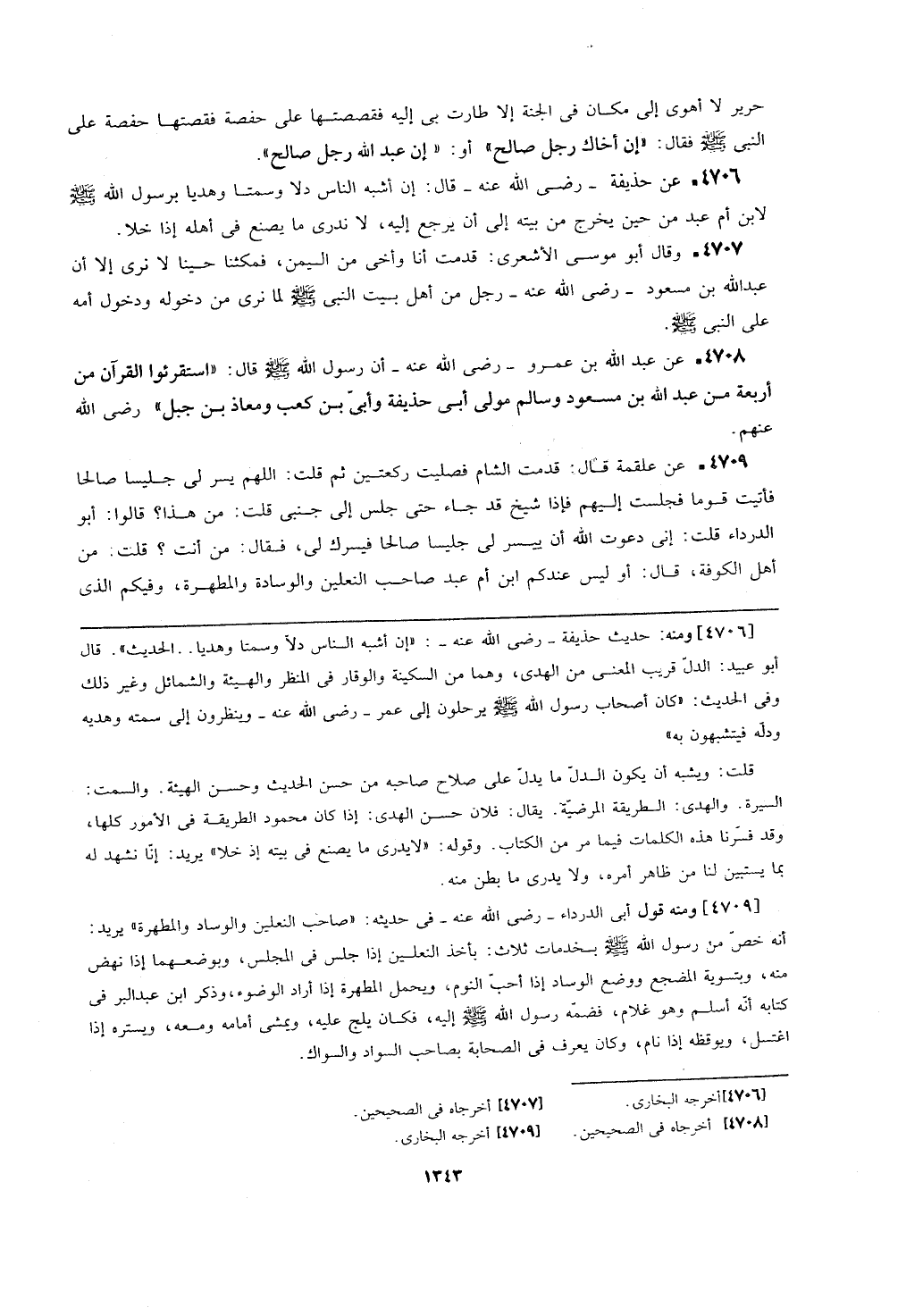 [4709] ومنه قول أبي الدرداء- رضي الله عنه- في حديثه: (صاحب النعلين والوساد والمطهرة) يريد: أنه خص من رسول الله - صلى الله عليه وسلم - بخدمات ثلاث: بأخذ النعلين إذا جلس في المجلس، وبوضعهما إذا نهض منه، وبتسوية المضجع ووضع الوساد إذا أحب النوم، ويحمل المطهرة إذا أراد الوضوء، وذكر ابن عبد البر في كتابه أنه أسلم وهو غلام، فضمه رسول الله - صلى الله عليه وسلم - إليه، فكان يلج عليه، ويمشي أمامه ومعه، ويستره إذا اغتسل، ويوقظه إذا نام، وكان يعرف في الصحابة بصاحب السواد والسواك.