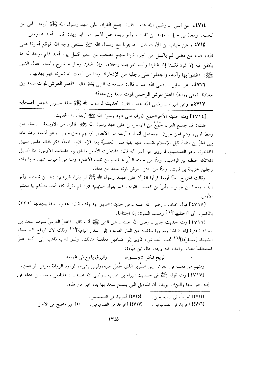 [4716] ومنه حديث جابر- رضي الله عنه- عن النبي - صلى الله عليه وسلم - أنه قال: (اهتز العرش لموت سعد بن معاذ) (اهتز) [اهتشاشا وسرورا بنقلته من الدار الفانية، إلى الدار الباقية] وذلك لأن أرواح السعداء الشهداء [مستقرها] تحت العرش، تأوى إلى قناديل معلقة هنالك، ولو ذهب ذاهب إلى أنه اهتز استعظاما لتلك الوقعة، فله وجه. قال ابن ميادة:
