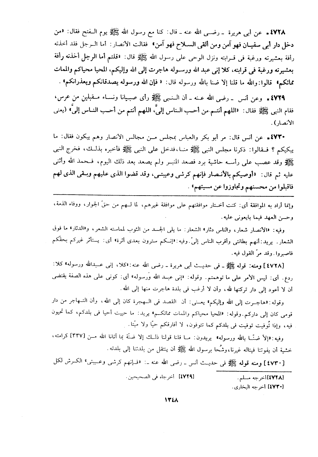 وفيه: (الأنصار شعار، والناس دثار) الشعار: ما يلي الجسد منا لثوب لمماسته الشعر، و (الدثار) ما فوق الشعار. يريد: أنهم بطانتي وأقرب الناس إلى. وفيه: (إنكم سترون بعدي أثرة) أي: يستأثر غيركم بحقكم فاصبروا. وقد مر القول فيه.