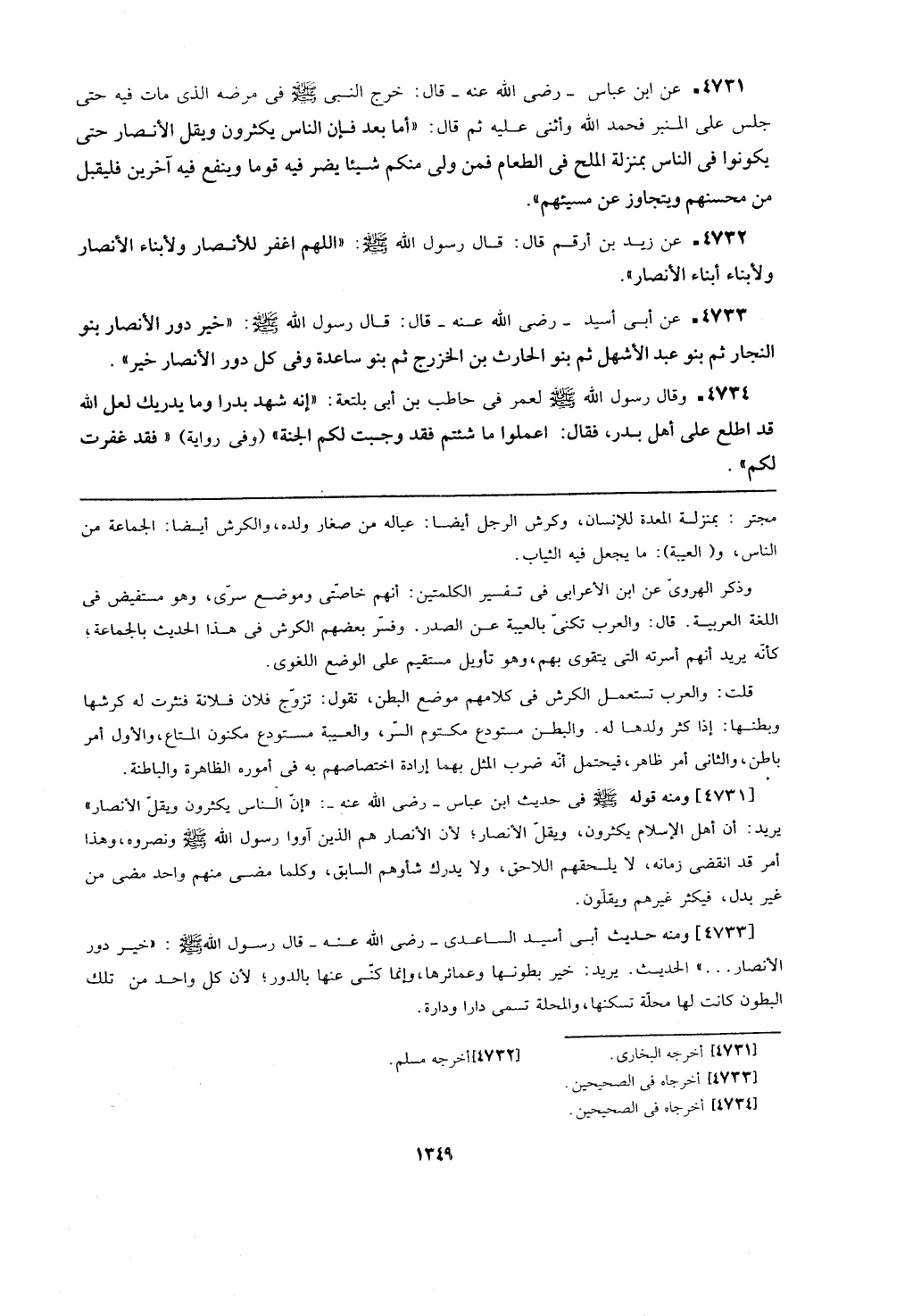 [4731] ومنه قوله - صلى الله عليه وسلم - في حديث ابن عباس- رضي الله عنه-: (إن الناس يكثرون ويقل الأنصار) يريد: أن أهل الإسلام يكثرون، ويقل الأنصار؛ لأن الأنصار هم الذين آووا رسول الله - صلى الله عليه وسلم - ونصروه، وهذا أمر قد انقضى زمانه، لا يلحقهم اللاحق، ولا يدرك شأوهم السابق، وكلما مضى منهم واحد مضى من غير بدل، فيكثر غيرهم ويقلون.