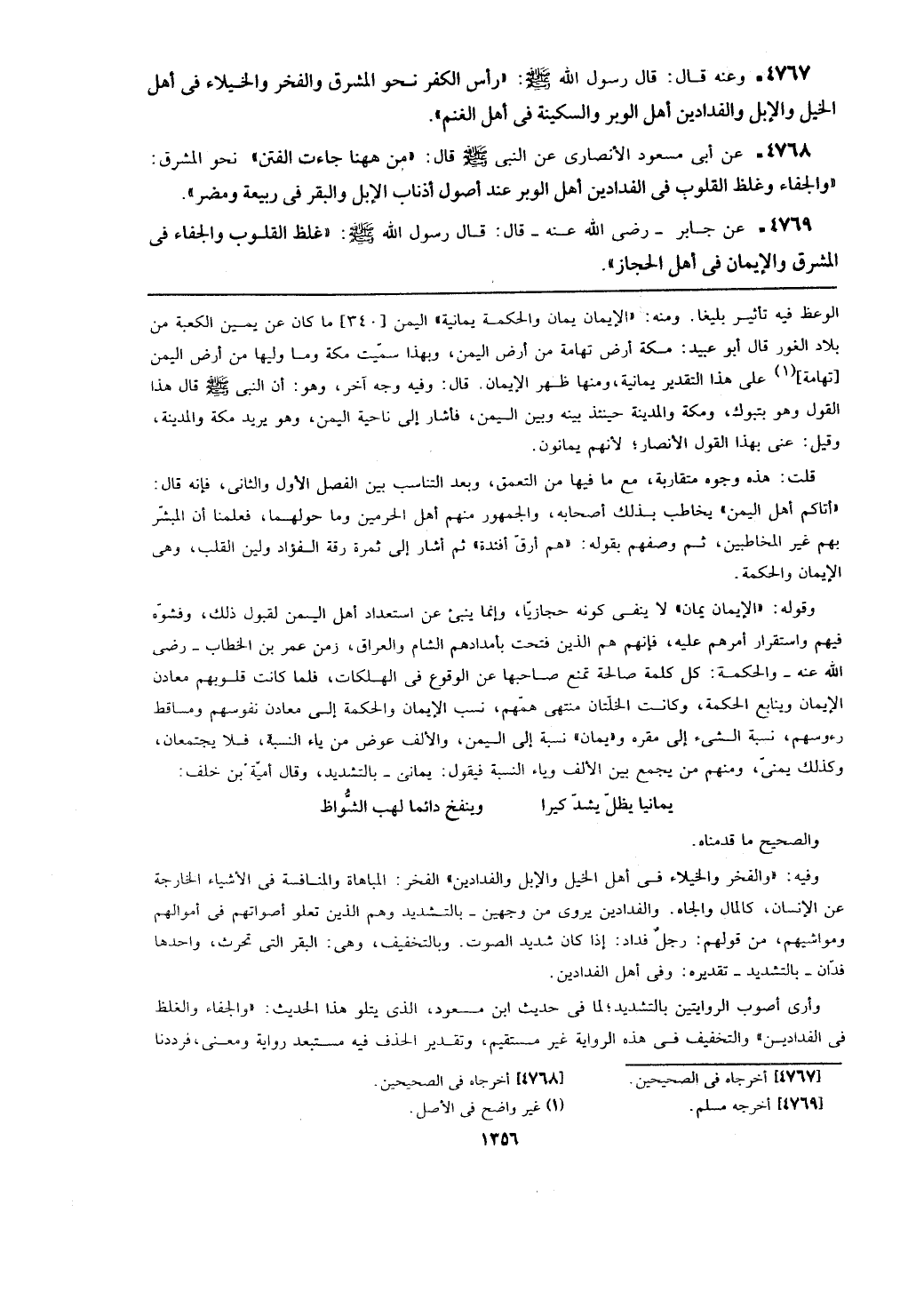 وأرى أصوب الراويتين بالتشديد؛ لما في حديث ابن مسعود، الذي يتلو هذا الحديث: (والجفاء والغلظ في الفدادين) والتخفيف في هذه الراوية غير مستقيم، وتقدير الحذف فيه مستبعد رواية ومعنى، فرددنا