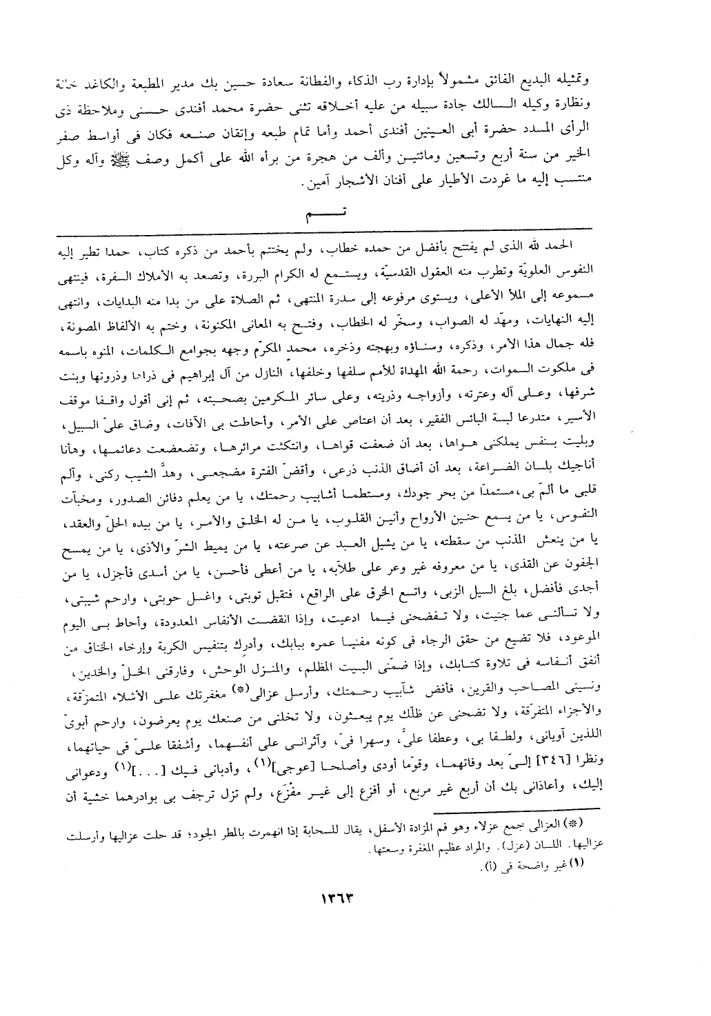 الحمد لله الذي لم يفتتح بأفضل من حمده الخطاب، ولم يختتم بأحمد من ذكره كتاب، حمدا تطير إليه النفوس العلوية وتطرب منه العقول القدسية، ويستمع له الكرام البررة، وتصعد به الملاك السفرة، فينتهي مسموعه إلى الملأ الأعلى، ويستوى مرفوعه إلى سدرة المنتهى، ثم الصلاة على من بدا منه البدايات، وانتهى إليه النهايات، ومهد له الصواب، وسخر له الخطاب، وفتح به المعاني المكنونة، وختم به الألفاظ المصون، فله جمال هذا الأمر، وذكره، وسناؤه وبهجته وذخره، محمد المكرم وجهه بجوامع الكلمات، المنوه باسمه في ملكوت السموات، رحمة الله المهداة للأمم سلفها وخلفها، النازل من آل إبراهيم في ذراها وذروتها وبنت شرفها، وعلى آله وعترته، وأزواجه وذريته، وعلى سائر المكرمين بصحبته، ثم إني أقول واقفا موقف الأسير، متدرعا لبسة البائس الفقير، بعد أن اعتاص على الأمر، وأحاطت بى الآفات، وضاق على السبيل، وبليت بنفس يملكني هواها، بعد أن ضعفت قواها، وانتكثت مرائرها، وتضعضت دعائمها، وهأنا أناجيك بلسان الضراعة، بعد أن أضاق الذنب ذرعى، وأقض الفترة في مضجعي، وهد الشيب ركني، وآلم قلبي ما ألم بى، مستمدا من بحر جودك، ومستطما أشايب رحمتك، يا من يعلم دفائن الصدور، ومخبآت النفوس، يا من يسمع حنين الأرواح وأنين القلوب، يا من له الخلق والأمر، يا من بيده الحل والعقد، يا من ينعش المذنب من سقطته، يا من يشيل العبد عن صرعته، يا من يميط الشر والأذى، يا من يمسح الجفون عن القذى، يا من معروفه غير وعر على طلابه، يا من أعطى فأحسن، يا من أسدى فأجزل، يا من أجدى فأفضل، بلغ السيل الزبي، واتسع الخرق على الراقع، فتقبل توبتي، واغسل حوبتي، وارحم شيبتي، ولا تسألني عما جنيت، ولا تفضحني فيما ادعيت، وإذا انقضت الأنفاس المعدودة، وأحاط بى اليوم الموعود، فلا تضيع من حقق الرجاء في كونه مفنيا عمره ببابك، وأدرك بتنفيس الكربة وإرخاء الخناق من أنفق أنفاسه في تلاوة كتابك، وإذا ضمني البيت المظلم، والمنزل الوحش، وفارقني الخل والخدين، ونسيني المصاحب والقرين، فأفض شآبيب رحمتك، وأرسل عزالى مغفرتك على الأشلاء المتمزقة، والأجزاء المتفرقة، ولا تضحني عن ظلم يوم يبعثون، ولا تخلني من صنعك يوم يعرضون، وارحم أبوي اللذين آوياني، ولطفا بي، وعطفا على، وسهرا في، وآثراني على أنفسهما، وأشفقا على في حياتهما، ونظرا [346] إلى بعد وفاتهما، وقوما أودى وأصلحا [عوجي]، وأدباني فيك ودعواني إليك، وأعاذني بك أن أربع غير مربع، أو أفزع إلى غير مفزع، ولم تزل ترجف بي بوادرهما خشية أن