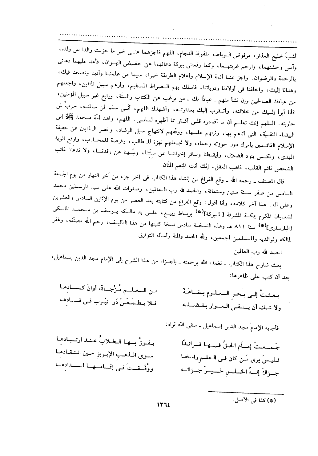 أشب خليع العذار، مرفوض الرباط، ملفوظ اللجام، اللهم فاجزهما عني خير ما جزيت والدا عن ولده، وآنس وحشتهما، وارحم غربتهما، وكما رفعتني ببركة دعائهما عن حضيض الهوان، فأعد عليهما دعائي بالرحمة والرضوان. واجز عنا أئمة الإسلام وأعلام الطريقة خيرا، لاسيما من علمنا وأدبنا ونصحنا فيك، وهدانا إليك، وأخلفنا في أولادنا وذرياتنا، فاسلك بهم الصراط المستقيم، وأرهم سبيل المتقين، واجعلهم من عبادك الصالحين وعن نشأ منهم-عياذا بك- من يرغب عن الكتاب والسنة، ويتبع غير سبيل المؤمنين، فأنا أبرأ إليك من خلالته، وأتقرب إليك بعداونه، وأشهدك اللهم، أني سلم لمن سالمته، حرب لمن حاربته. اللهم إنك تعلم أن ما أضمره قلبي أكثر مما أظهره لساني. اللهم، واهد أمة محمد - صلى الله عليه وسلم - إلى البيضاء النقية، التي بها، وثبتهم عليها، ووفقهم لانتهاج سبل الرشاد، وانصر الذابين عن حقيقة الإسلام القائمين بأمرك دون حوزته وحماه، ولا تجعلهم نهزة للطالب، وفرصة للمحارب، وارفع ألوية الهدى، ونكس بنود الضلال، وأيقظنا وسائر إخواننا عن سنتنا، ونبهنا عن رقدتنا، ولا تدعنا غائب الشخص نائم القلب، ذاهب العقل، إنك أنت المنعم المنان.