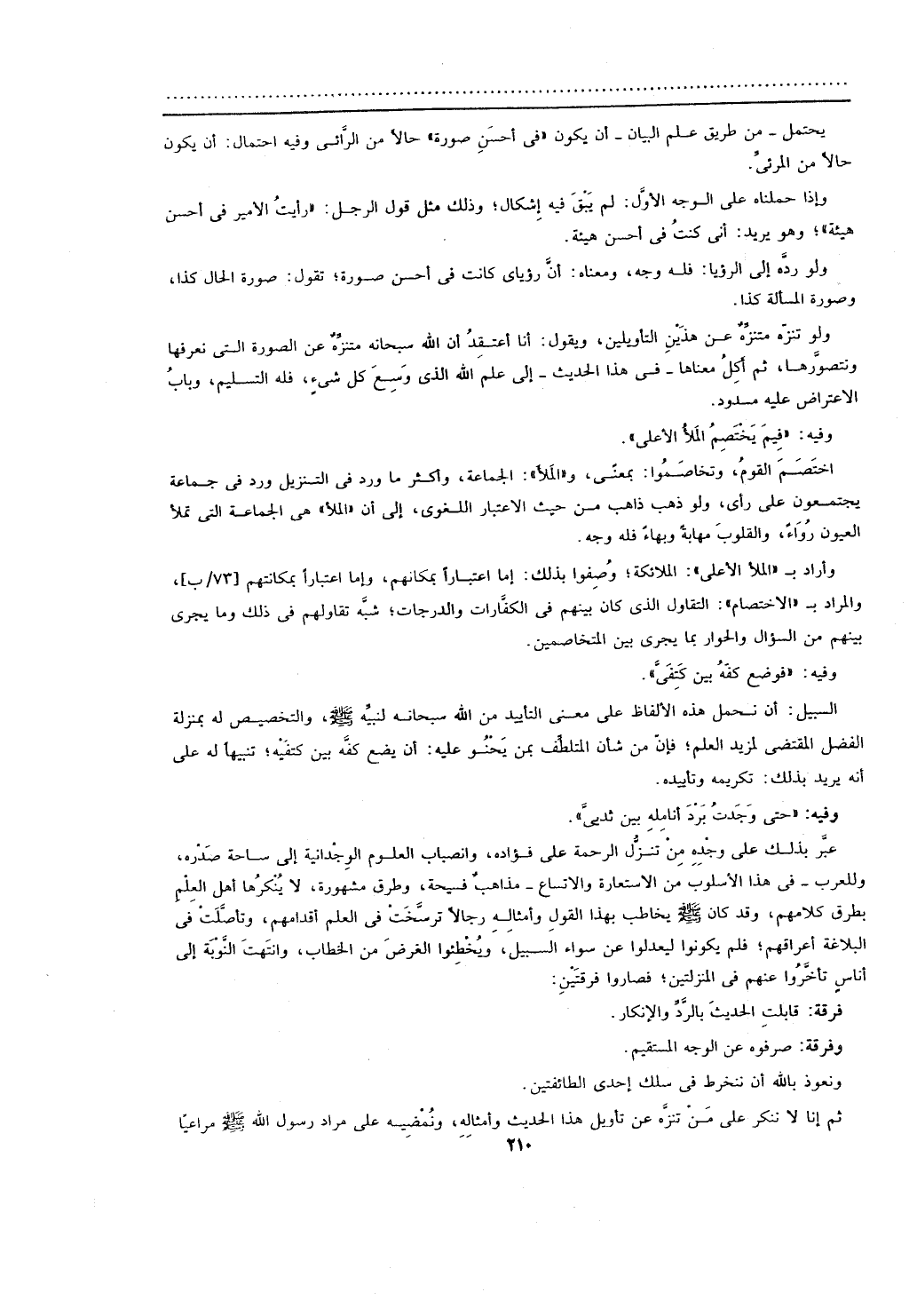 وأراد بـ (الملأ الأعلى): الملائكة؛ وصفوا بذلك: إما اعتبارا بمكانهم، وإما اعتبارا بمكانتهم [73/ب]، والمراد بـ (الاختصام): التقاول الذي كان بينهم في الكفارات والدرجات؛ شبه تقاولهم في ذلك وما يجري بينهم من السؤال والحوار بما يجري بين المتخاصمين.