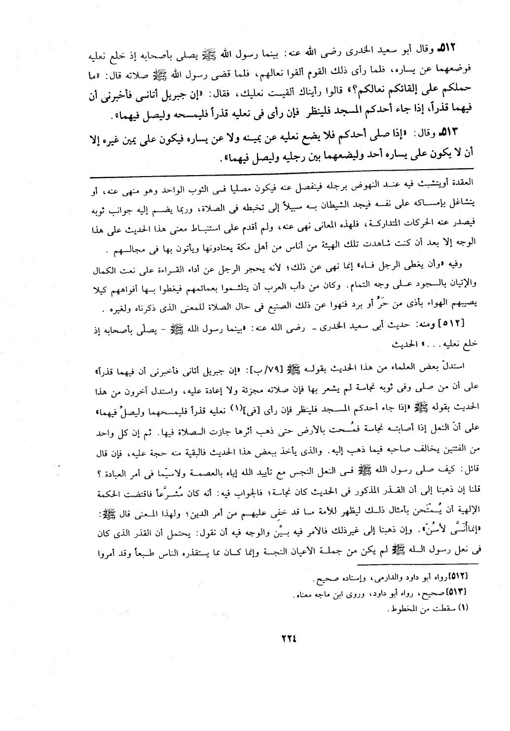 استدل بعض العلماء من هذا الحديث بقوله - صلى الله عليه وسلم -[79/ب]: (إن جبريل أتاني فأخبرني أن فيهما قذرا) على أن من صلى وفي ثوبه نجاسة لم يشعر بها فإن صلاته مجزئة ولا إعادة عليه، واستدل آخرون من هذا الحديث بقوله - صلى الله عليه وسلم - (إذا جاء أحدكم المسجد فلينظر فإن رأى [في] نعليه قذرا فليمسحهما وليصل فيهما) على أن النعل إذا أصابته نجاسة فمسحت بالأرض حتى ذهب أثرها جازت الصلاة فيها. ثم إن كل واحد من الفئتين يخالف صاحبه فيما ذهب إليه. والذي يأخذ ببعض هذا الحديث فالبقية منه حجة عليه، فإن قال قائل: كيف صلى رسول الله - صلى الله عليه وسلم - في النعل النجس مع تأييد الله إياه بالعصمة ولاسيما في أمر العبادة؟ قلنا إن ذهبنا إلى أن القذر المذكور في الحديث كان نجاسة؛ فالجواب فيه: أنه كان مشرعا فاقتضت الحكمة الإلهية أن يمتحن بأمثال ذلك ليظهر للأمة ما قد خفي عليهم من أمر الدين؛ ولهذا المعنى قال - صلى الله عليه وسلم -: (إنما أنسى لأسن). وإن ذهبنا إلى غير ذلك فالأمر فيه بين والوجه فيه أن نقول: يحتمل أن القذر الذي كان في نعل رسول الله - صلى الله عليه وسلم - لم يكن من جملة الأعيان النجسة وإنما كان مما يستقذره الناس طبعا وقد أمروا