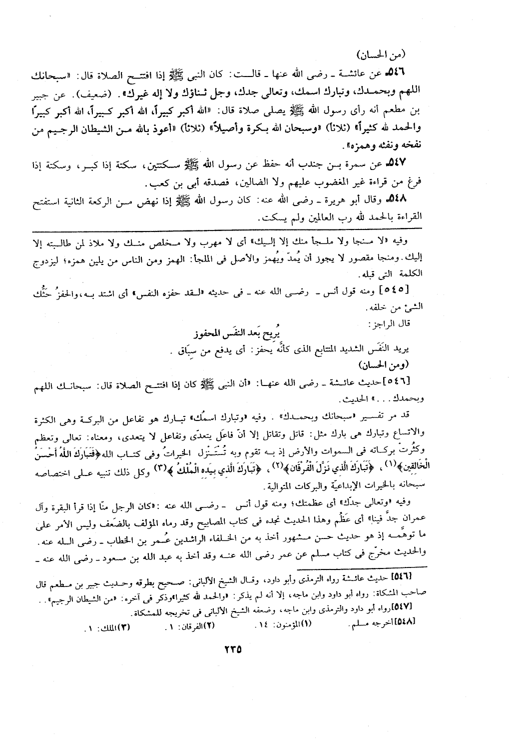 وفيه (وتعالى جدك) أي عظمتك؛ ومنه قول أنس- رضي الله عنه: (كان الرجل منا إذا قرأ البقرة وآل عمران جد فينا) أي عظم وهذا الحديث نجده في كتاب المصابيح وقد رماه المؤلف بالضعف وليس الأمر على ما توهمه إذ هو حديث حسن مشهور أخذ به من الخلفاء الراشدين عمر بن الخطاب- رضي الله عنه. والحديث مخرج في كتاب مسلم عن عمر رضي الله عنه وقد أخذ به عبد الله بن مسعود- رضي الله عنه-