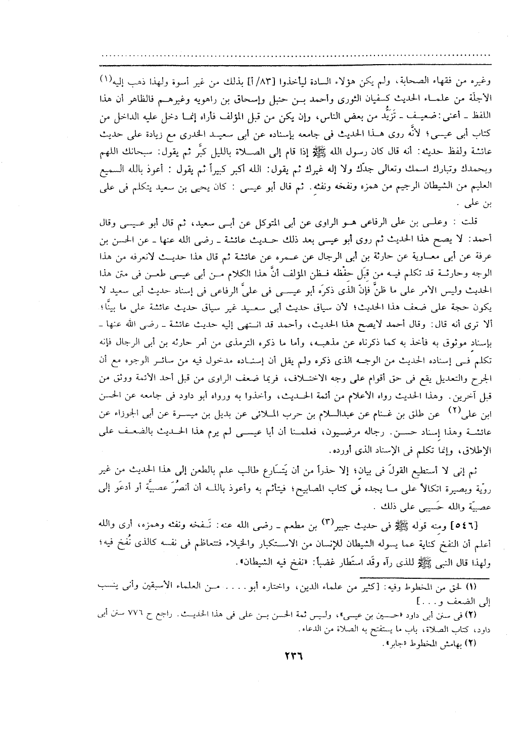 قلت: وعلي بن علي الرفاعي هو الراوي عن أبي المتوكل عن أبي سعيد، ثم قال أبو عيسى وقال أحمد: لا يصح هذا الحديث ثم روى أبو عيسى بعد ذلك حديث عائشة- رضي الله عنها- عن الحسن بن عرفة عن أبي معاوية عن حارثة بن أبي الرجال عن عمره عن عائشة ثم قال هذا حديث لا نعرفه من هذا الوجه وحارثة قد تكلم فيه من قبل حفظه فظن المؤلف أن هذا الكلام من أبي عيسى طعن في متن هذا الحديث وليس الأمر على ما ظن فإن الذي ذكره أبو عيسى في علي الرفاعي في إسناد حديث أبي سعيد لا يكون حجة على ضعف هذا الحديث؛ لأن سياق حديث أبي سعيد غير سياق حديث عائشة على ما بينا؛ ألا ترى أنه قال: وقال أحمد لا يصح هذا الحديث، وأحمد قد انتهى إليه حديث عائشة- رضي الله عنها- بإسناد موثوق به فأخذ به كما ذكرناه عن مذهبه، وأما ما ذكره الترمذي من أمر حارثة بن أبي الرجال فإنه تكلم في إسناده الحديث من الوجه الذي ذكره ولم يقل أن إسناده مدخول فيه من سائر الوجوه مع أن الجرح والتعديل يقع في حق أقوام على وجه الاختلاف، فربما ضعف الراوي من قبل أحد الأئمة ووثق من قبل آخرين. وهذا الحديث رواه الأعلام من أئمة الحديث، وأخذوا به ورواه أبو داود في جامعه عن الحسن ابن علي عن طلق بن غنام عن عبد السلام بن حرب الملائي عن بديل بن ميسرة عن أبي الجوزاء عن عائشة وهذا إسناد حسن. رجاله مرضيون، فعلمنا أن أبا عيسى لم يرم هذا الحديث بالضعف على الإطلاق، وإنما تكلم في الإسناد الذي أورده.