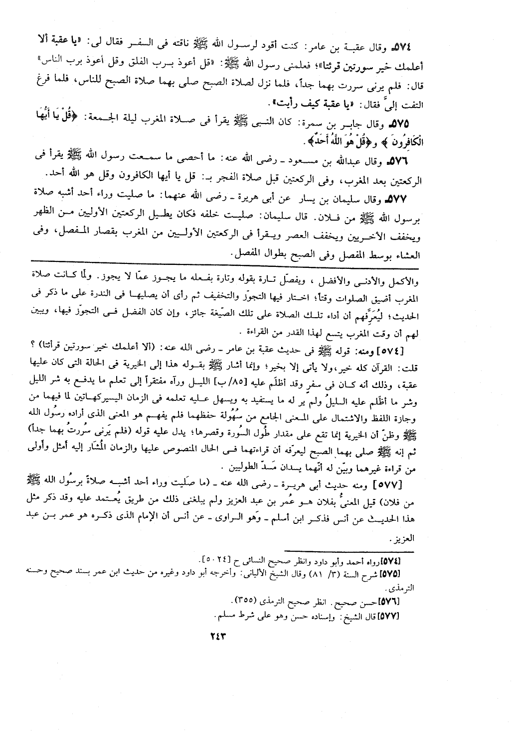 [574] ومنه: قوله - صلى الله عليه وسلم - في حديث عقبة بن عامر- رضي الله عنه: (ألا أعلمك خير سورتين قرأئتا)؟ قلت: القرآن كله خير، ولا يأتي إلا بخير؛ وإنما أشار - صلى الله عليه وسلم - بقوله هذا إلى الخيرية في الحالة التي كان عليها عقبة، وذلك أنه كان في سفر وقد أظلم عليه [85/ب] الليل ورآه مفتقرا إلى تعلم ما يدفع به شر الليل وشر ما أظلم عليه الليل ولم ير له ما يستفيد به ويسهل عليه تعلمه في الزمان اليسير كهاتين لما فيهما من وجازة اللفظ والاشتمال على المعنى الجامع من سهولة حفظهما فلم يفهم هو المعنى الذي أراده رسول الله - صلى الله عليه وسلم - ون أن الخيرية إنما تقع على مقدار طول السورة وقصرها؛ يدل عليه قوله (فلم يرني سررت بهما جدا) ثم إنه - صلى الله عليه وسلم - صلى بهما الصبح ليعرفه أن قراءتهما في الحال المنصوص عليها والزمان المشار إليه أمثل وأولى من قراءة غيرهما وبين له أنهما يسدان مسد الطوليين.