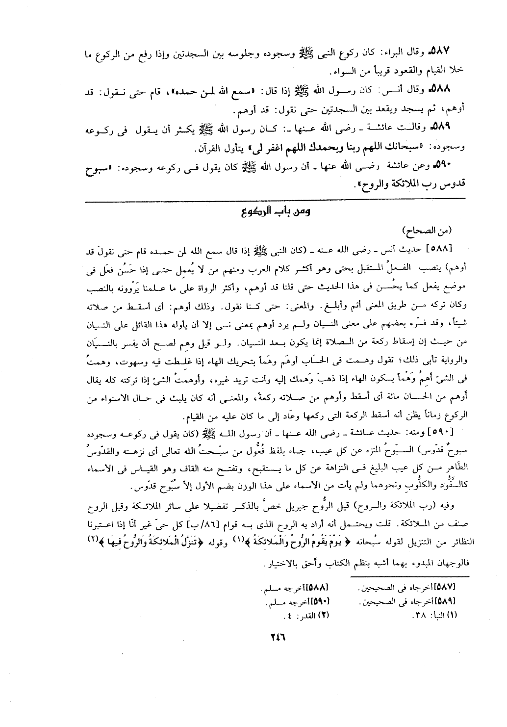 وفيه (رب الملائكة والروح) قيل الروح جبريل خص بالذكر تفضيلا على سائر الملائكة وقيل الروح صنف من الملائكة. قلت ويحتمل أنه أراد به الروح الذي به قوام [86/ب] كل حي غير أنا إذا اعتبرنا النظائر من التنزيل لقوله سبحانه {يوم يقوم الروح والملائكة} وقوله {تنزل الملائكة والروح فيها} فالوجهان المبدوء بهما أشبه بنظم الكتاب وأحق بالاختيار.