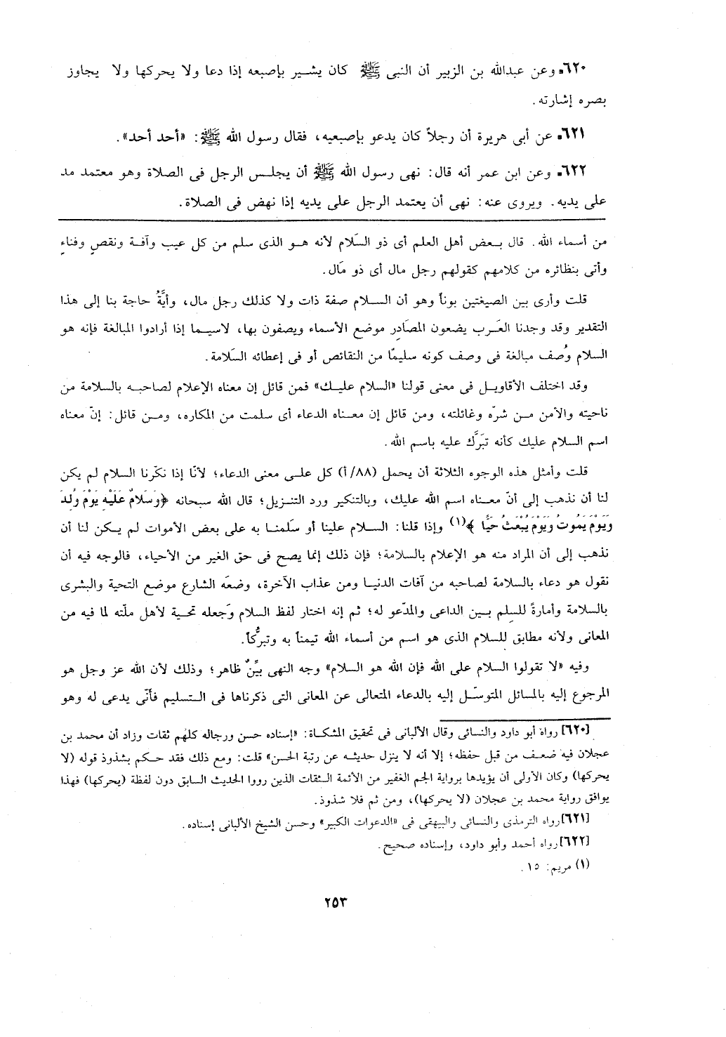 وفيه (لا تقولوا السلام على الله فإن الله هو السلام) وجه النهي بين ظاهر؛ وذلك لأن الله عز وجل هو المرجوع إليه بالمسائل المتوسل إليه بالدعاء المتعالي عن المعاني التي ذكرناها في التسليم فأنى يدعى له وهو