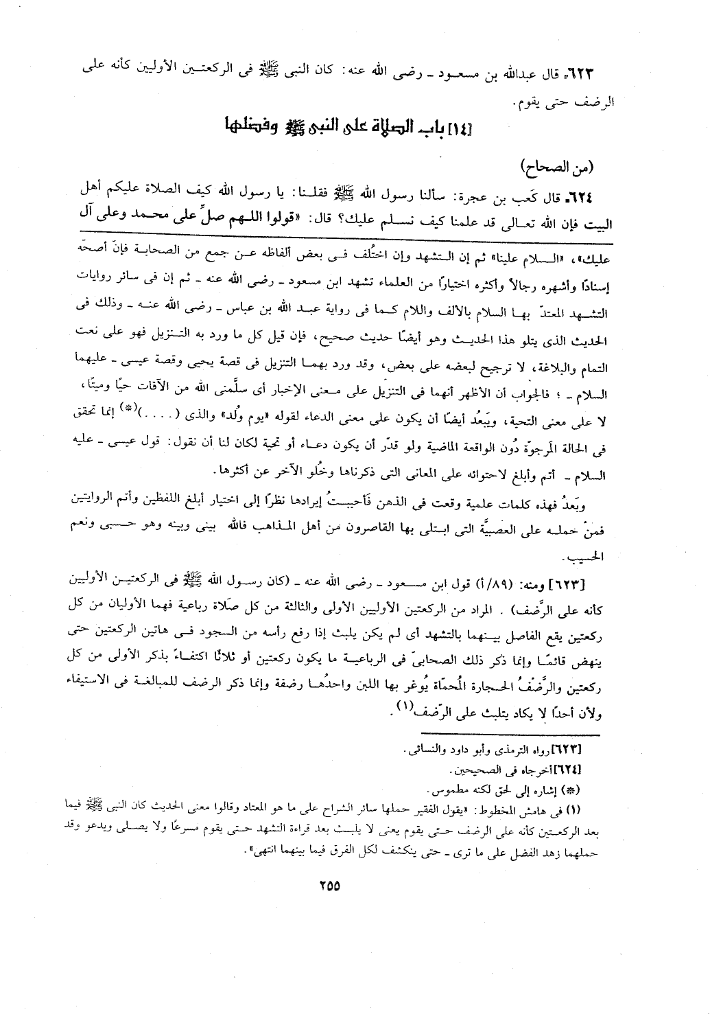 [623] ومنه: (89/أ) قول ابن مسعود- رضي الله عنه- (كان رسول الله - صلى الله عليه وسلم - في الركعتين الأوليين كأنه على الرضف). المراد من الركعتين الأوليين الأولى والثالثة من كل صلاة رباعية فهما الأوليان من كل ركعتين يقع الفاصل بينهما بالتشهد أي لم يكن يلبث إذا رفع رأسه من السجود في هاتين الركعتين حتى ينهض قائما وإنما ذكر ذلك الصحابي في الرباعية ما يكون ركعتين أو ثلاثا اكتفاء بذكر الأولى من كل ركعتين والرضف الحجارة المحماة يوغر بها اللبن واحدها رضفة وإنما ذكر الرضف للمبالغة في الاستيفاء ولأن أحدا لا يكاد يتلبث على الرضف.