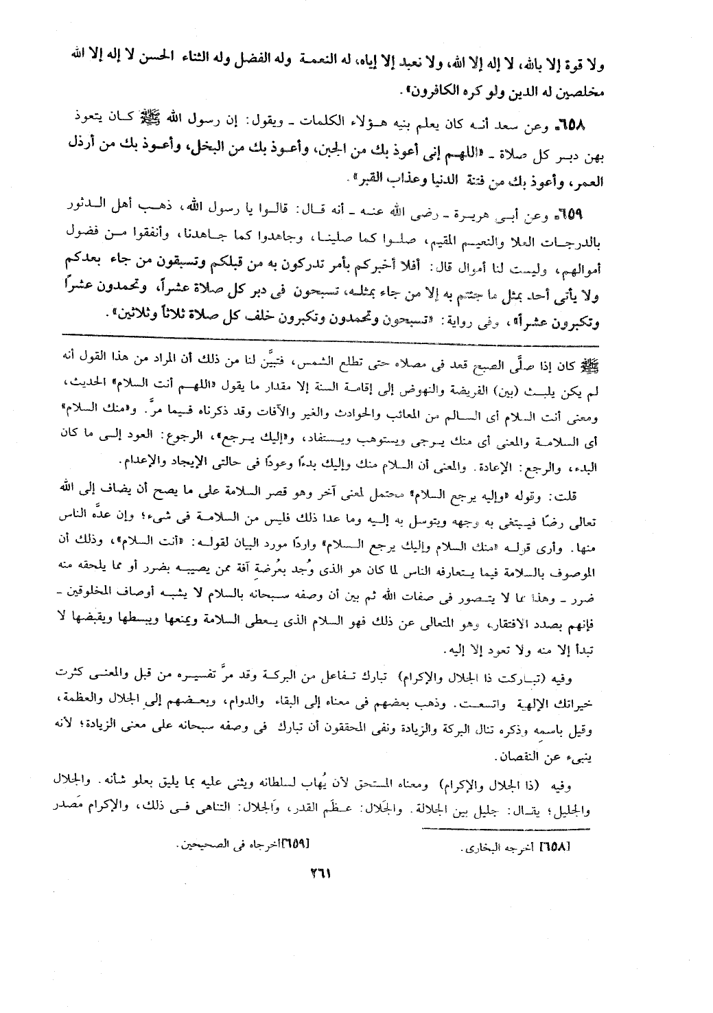 - صلى الله عليه وسلم - كان إذا صلى الصبح قعد في مصلاه حتى تطلع الشمس، فتبين لنا من ذلك أن المراد من هذا القول أنه لم يكن يلبث (بين) الفريضة والنهوض إلى إقامة السنة إلا مقدار ما يقول (اللهم أنت السلام) الحديث، ومعنى أنت السلام أي السالم من المعائب والحوادث والغير والآفات وقد ذكرناه فيما مر. و (منك السلام) أي السلامة والمعنى أي منك يرجى ويستوهب ويستفاد، و (إليك يرجع)، الرجوع: العود إلى ما كان البدء، والرجع: الإعادة. والمعنى أن السلام منك وإليك بدءا وعودا في حالتي الإيجاد والإعدام.