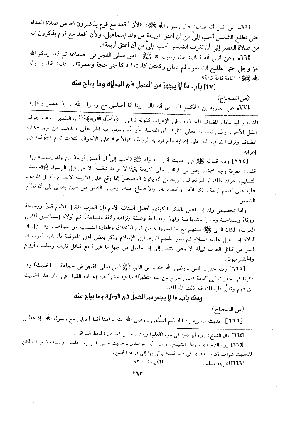 [665] ومنه حديث أنس- رضي الله عنه- عن النبي - صلى الله عليه وسلم - (من صلى الفجر في جماعة ... الحديث) وقد ذكرنا في حديث أبي أمامة (من خرج من بيته متطهرا) ما فيه مغنى عن إعادة القول في بيان هذا الحديق لمن فهم وتدبر فليسلك فيه ذلك المسلك.