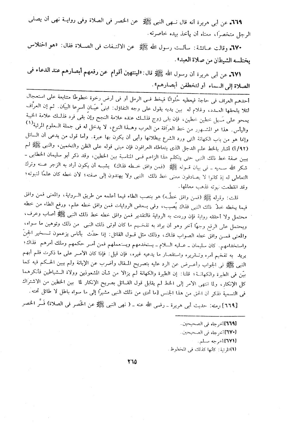 أحدهم العراف في حاجة فيعطيه حلوانا فيخط في الرمل أو في أرض رخوة خطوطا متتابعة على استعجال لئلا يلحقها العدد، وغلام له بين يديه يقول على وجه التفاؤل: ابني عيان أسرعا البيان. ثم إن العراف يمحو على مهل خطين خطين، فإن بقى زوج فذلك عنده علامة النجح وإن بقى فرد فذلك علامة الخيبة واليأس. هذا هوا المشهور من خط العرافة من العرب وهذا النوع، لا يدخل له في جملة العلوم المرئية وإنما هو من باب الكهانة التي ورد الشرع ببطلانها وأبى أن يكون بها عبرة. وأما قول من يدعي أن السائل (92/أ) أشار بالخط علم الدجل الذي يتعاطاه العرافون فإن مبنى قوله على الظن والتخمين، والنبي - صلى الله عليه وسلم - لم يبين صفة خط ذلك النبي حتى يتكلم هذا الزاعم في المناسبة بين الخطين، وقد ذكر أبو سليمان الخطابي- شكر الله سعيه- في بيان قوله - صلى الله عليه وسلم - (فمن وافق خطه فذاك) يشبه أن يكون أرد به الزجر عنه وترك التعاطي له إذ كانوا لا يصادفون معنى خط ذلك النبي ولا يهتدون إلى صفته؛ لأن خطه كان علما لنبوته؛ وقد انقطعت نبوته فذهب معالمها.