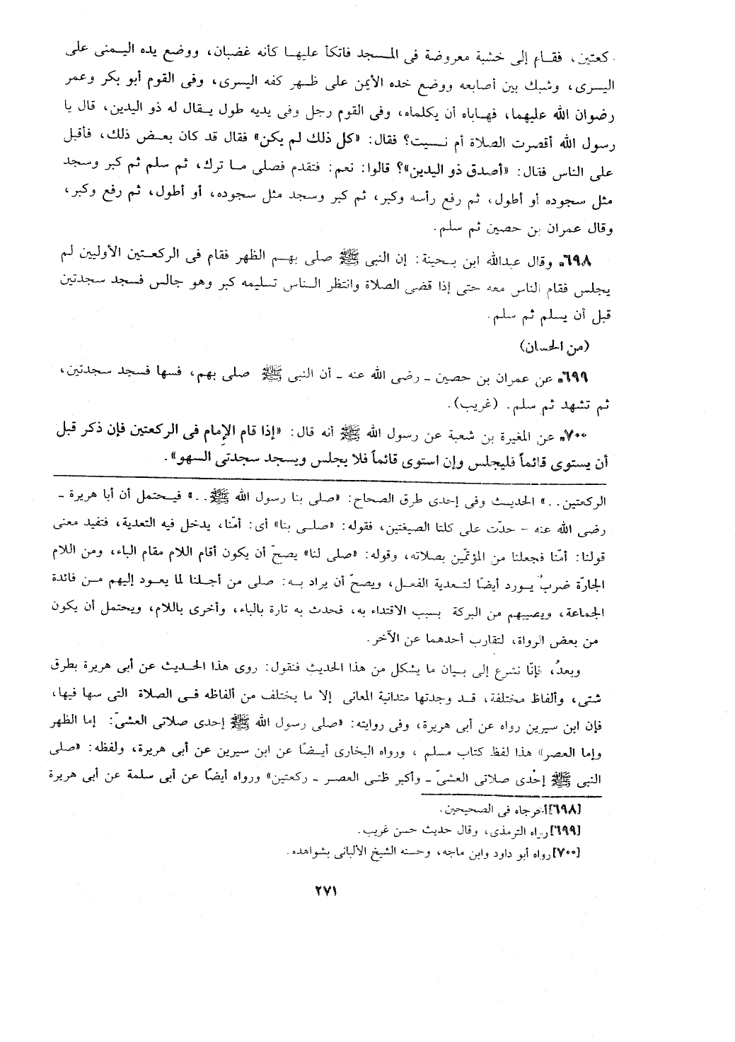 وبعد، فإنا نشرع إلى بيان ما يشكل من هذا الحديث فنقول: روي هذا الحديث عن أبي هريرة بطرق شتى، وألفاظ مختلفة، قد وجدتها متدانية المعاني إلا ما يختلف من ألفاظه في الصلاة التي سها فيها، فإن ابن سيرين رواه عن أبي هريرة، وفي روايته: (صلى رسول الله - صلى الله عليه وسلم - إحدى صلاتي العشي: إما الظهر وإما العصر) هذا لفظ كتاب مسلم، ورواه البخاري أيضا عن ابن سيرين عن أبي هريرة، ولفظه: (صلى النبي - صلى الله عليه وسلم - إحدى صلاتي العشي- وأكبر ظني العصر- ركعتين) ورواه أيضا عن أبي سلمة عن أبي هريرة