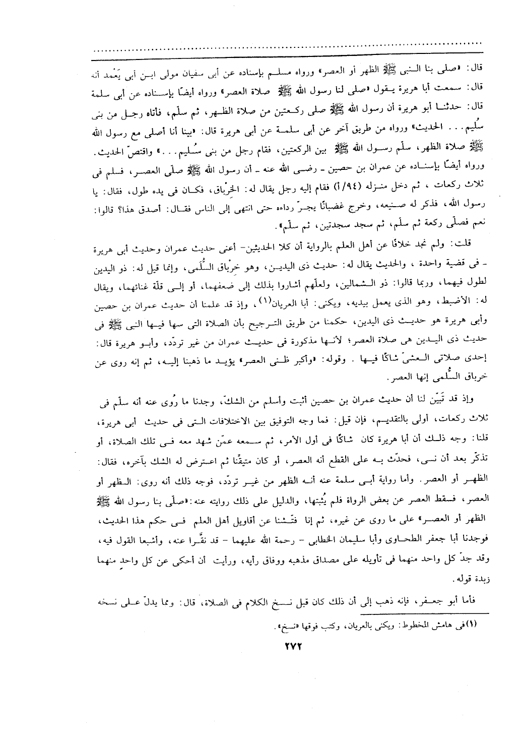 قال: (صلى بنا النبي - صلى الله عليه وسلم - الظهر أو العصر) ورواه مسلم بإسناده عن أبي سفيان مولى ابن أبي يعمد أنه قال: سمعت أبا هريرة يقول (صلى لنا رسول الله - صلى الله عليه وسلم - صلاة العصر) ورواه أيضا بإسناده عن أبي سلمة قال: حدثنا أبو هريرة أن رسول الله - صلى الله عليه وسلم - صلى ركعتين من صلاة الظهر، ثم سلم، فأتاه رجل من بني سليم ... الحديث) ورواه من طريق آخر عن أبي هريرة قال: (بينا أنا أصلي مع رسول الله - صلى الله عليه وسلم - صلاة الظهر، سلم رسول الله - صلى الله عليه وسلم - بين الركعتين، فقام رجل من بني سليم ...) واقتص الحديث.
