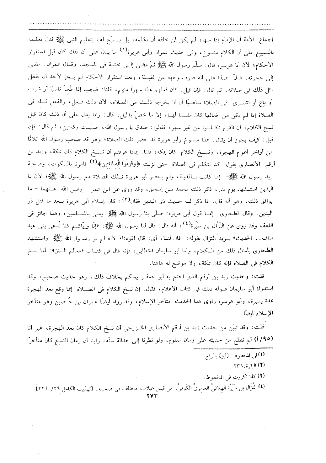 قلت: وحديث زيد بن أرقم الذي احتج به أبو جعفر يحكم بخلاف ذلك، وهو حديث صحيح، وقد استدرك أبو سليمان قوله ذلك في كتاب الأعلام، فقال: إن نسخ الكلام في الصلاة إنما وقع بعد الهجرة بمدة يسيرة، وأبو هريرة راوي هذا الحديث متأخر الإسلام، وقد رواه أيضا عمران بن حصين وهو متأخر الإسلام أيضا.