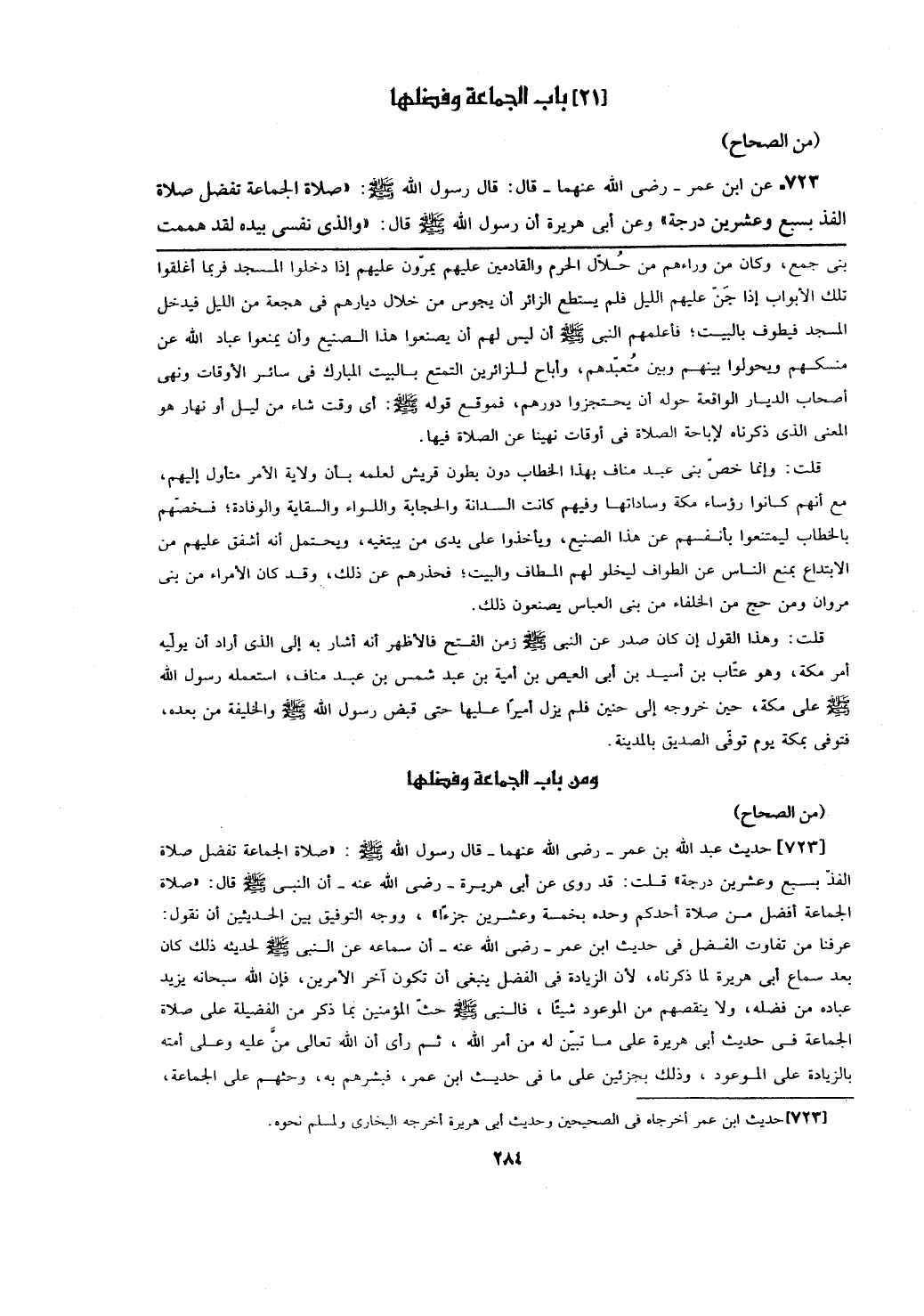 [723] حديث عبد الله بن عمر- رضي الله عنهما- قال رسول الله - صلى الله عليه وسلم -: (صلاة الجماعة تفضل صلاة الفذ بسبع وعشرين درجة) قلت: قد روي عن أبي هريرة- رضي الله عنه- أن النبي - صلى الله عليه وسلم - قال: (صلاة الجماعة أفضل من صلاة أحدكم وحده بخمسة وعشرين جزءا)، ووجه التوفيق بين الحديثين أن نقول: عرفنا من تفاوت الفضل في حديث ابن عمر- رضي الله عنه- أن سماعه عن النبي - صلى الله عليه وسلم - لحديثه ذلك كان بعد سماع أبي هريرة لما ذكرناه، لأن الزيادة في الفضل ينبغي أن تكون آخر الأمرين، فإن الله سبحانه يزيد عباده من فضله، ولا ينقصهم من الموعود شيئا، فالنبي - صلى الله عليه وسلم - حث المؤمنين بما ذكر من الفضيلة على صلاة الجماعة في حديث أبي هريرة على ما تبين له من أمر الله، ثم رأى أن الله تعالى من عليه وعلى أمته بالزيادة على الموعود، وذلك بجزئين على ما في حديث ابن عمر، فبشرهم به، وحثهم على الجماعة،